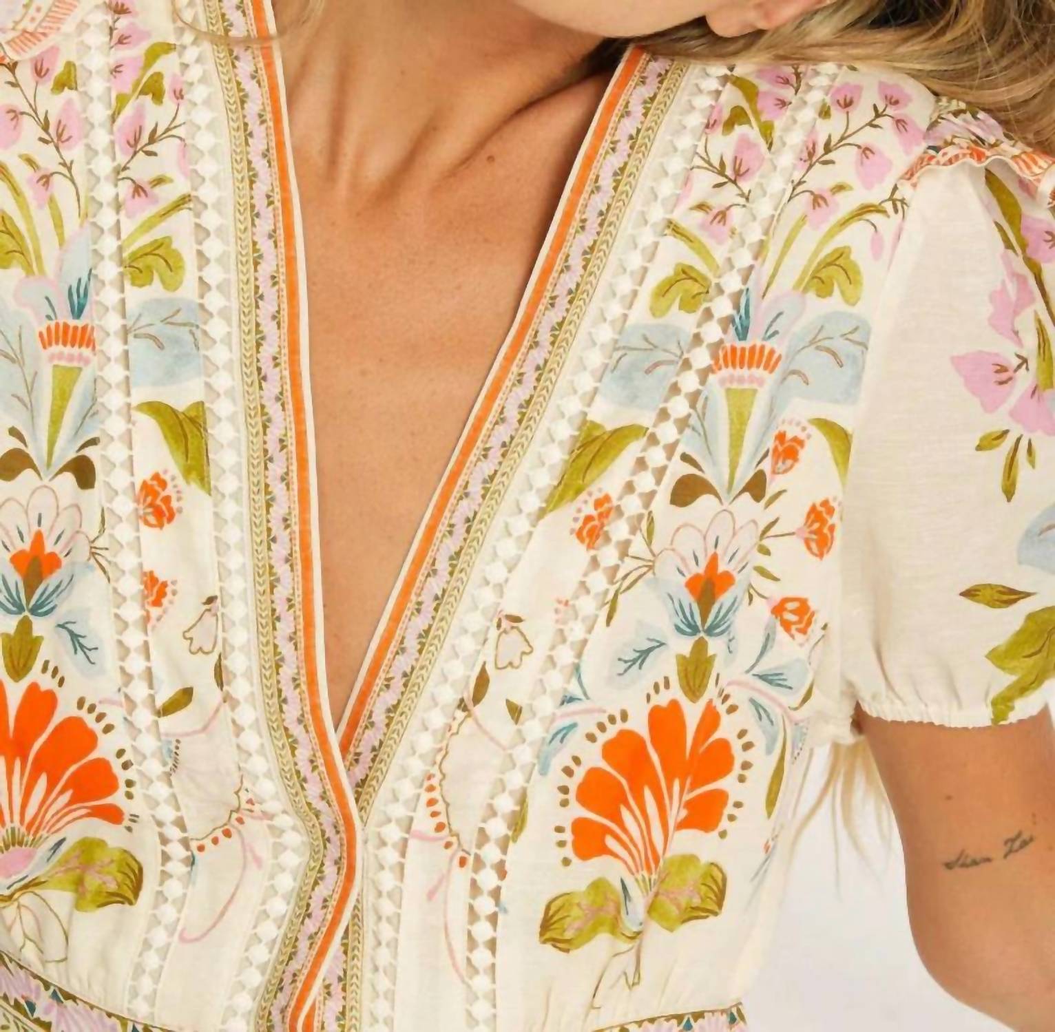 Throw it on and go! Introducing the Women's Dany Romper by CABALLERO in Vintage Floral, effortlessly combining playful style with spring charm. This romper features short puff sleeves with a delightful ruffle at the shoulder and a flattering V-neckline. Made from a breathable blend of 56% Lyocell and 44% Linen, it’s perfect for warm days with its short length and boho elegance. Closure: Snap closure with faux button fly detail, and includes practical pockets and an elastic waistband for comfort. Care: Machine wash and tumble dry.