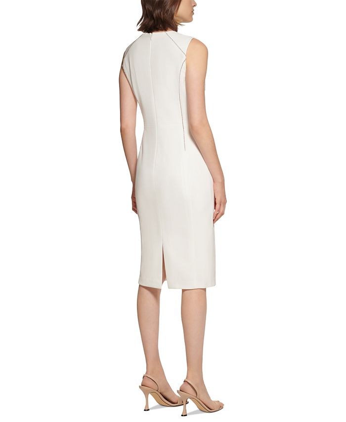Calvin Klein embellishes a structured and chic sheath dress with rhinestones dotted at the seams. | Approx. 40-1/2 long from center back neck to hem. Length is based on size 6 and varies 1/4 between sizes| Tailored fit through the chest| waist| and hips; sits close to the body| Scuba crepe; Stretchy and supportive| Jewel neckline; sheath silhouette