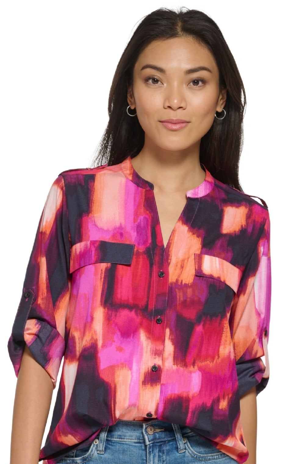 Refresh your wardrobe with this split neck button down blouse from Calvin Klein that you can dress up with slacks or keep casual with jeans.| Split neckline; button front closure| Imported| Roll tab long sleeves| Flap pocket at chest| | Size & Fit