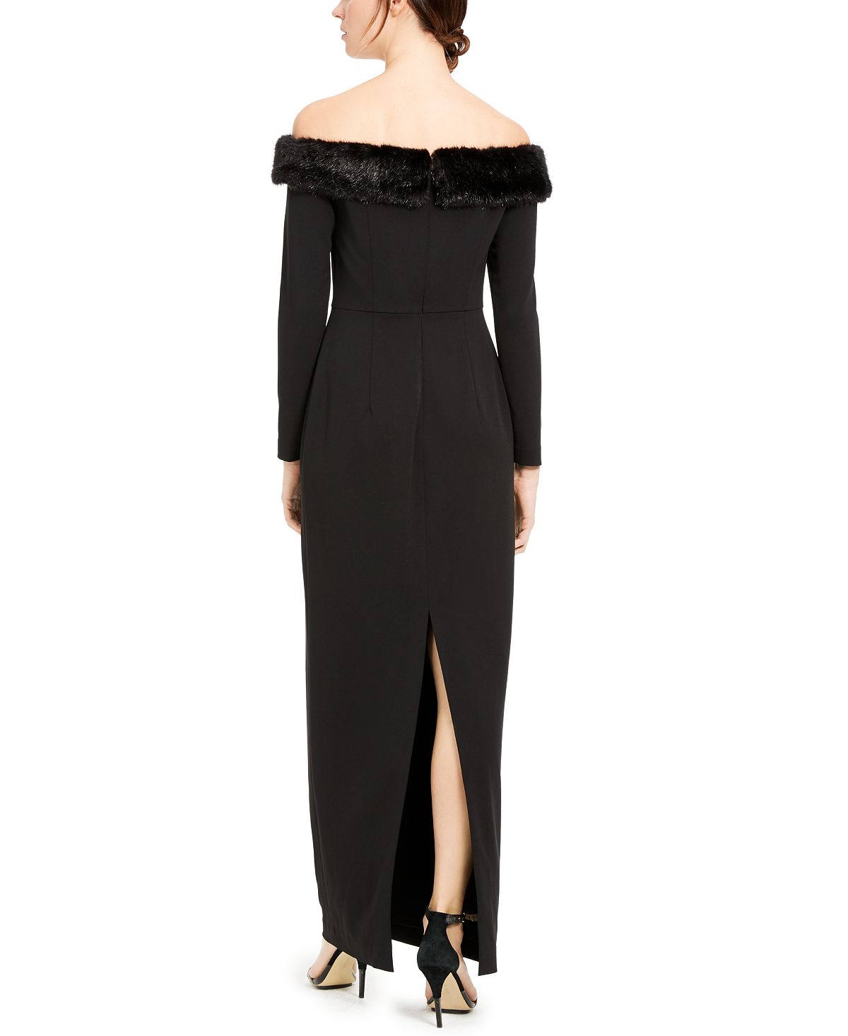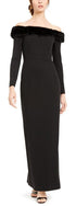 Make an unforgettable statement in this elegant off-the-shoulder gown from Calvin Klein| trimin luxurious faux fur for a high-style finish.| Approx. 54-1/2 long from center back neck to hem. Length is based on size 6 and varies 1/4 between sizes| Off-the-shoulder neckline with faux-fur trim| Hidden back zipper with hook-and-eye closure| Boning at bust; slit at back hem