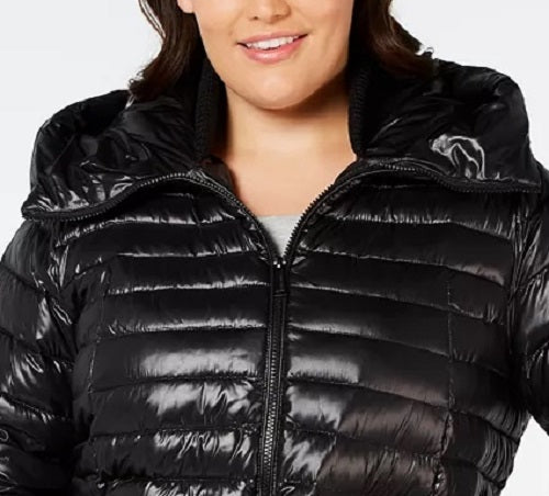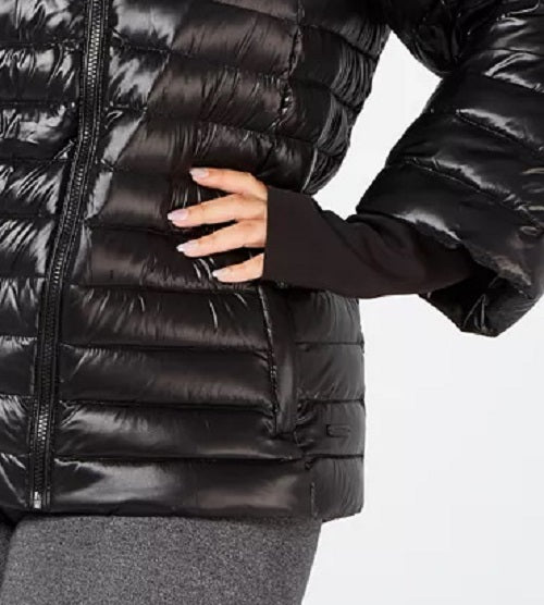 Short length|Down fill; lining|Attached hood; zipper closure at front; long sleeves with stretch cuffs, thumbholes; zip pockets at front, interior|Shell, lining: polyester/nylon; cuffs: polyester/spandex; fill: down|Machine washable|Imported