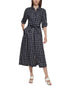 Look pretty in plaid with Calvin Klein's A-line shirtdress| cinched by a self-tie belt.| Approx. 47-1/2 long from center back neck to hem. Length is based on size 6 and varies 1/4 between sizes| Runs true to size; order your normal size| Fitted through the chest and waist; structured A-line skirt sits slightly over hips; Button-front dress| Point collar; A-line shirtdress silhouette| Hidden button-front closures