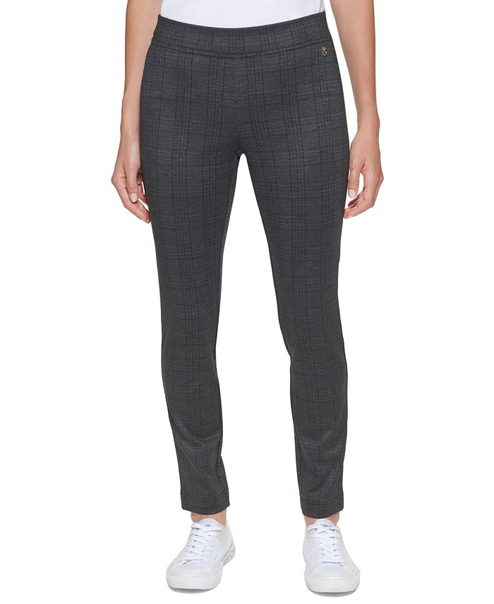 Pull-on sleek| polished style for weekday looks with these Calvin Klein pants in classic plaid.| Approx. inseam; 29| Front rise; approx. 9-1/2; back rise; approx. 15-1/4; slim fit through hips and thighs; straight leg| Pull-on style | Shell and lining; polyester/rayon/spandex| Machine washable