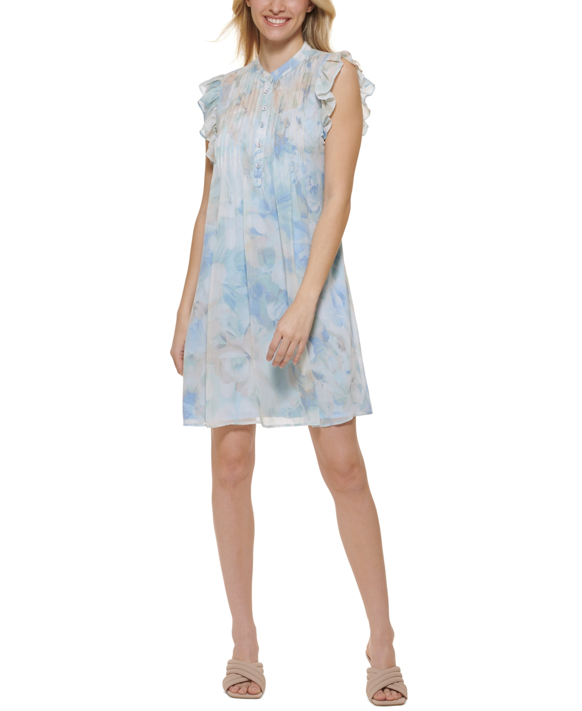 Flutter sleeves lend an elegant finish to Calvin Klein's printed A-line dress.| Partial front button closures| Imported| Band collar; A-line silhouette | Flutter sleeves| Chiffon; Smooth| sheer woven fabric