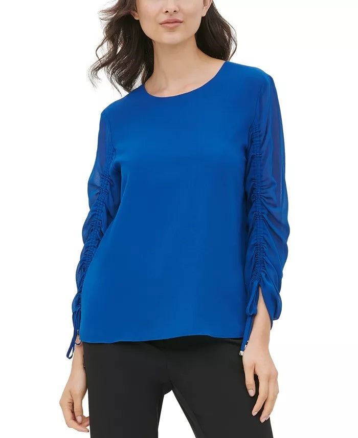 Calvin Klein Women's Scoop-Neck Drawstring-Sleeve Top Blue Size X-Large