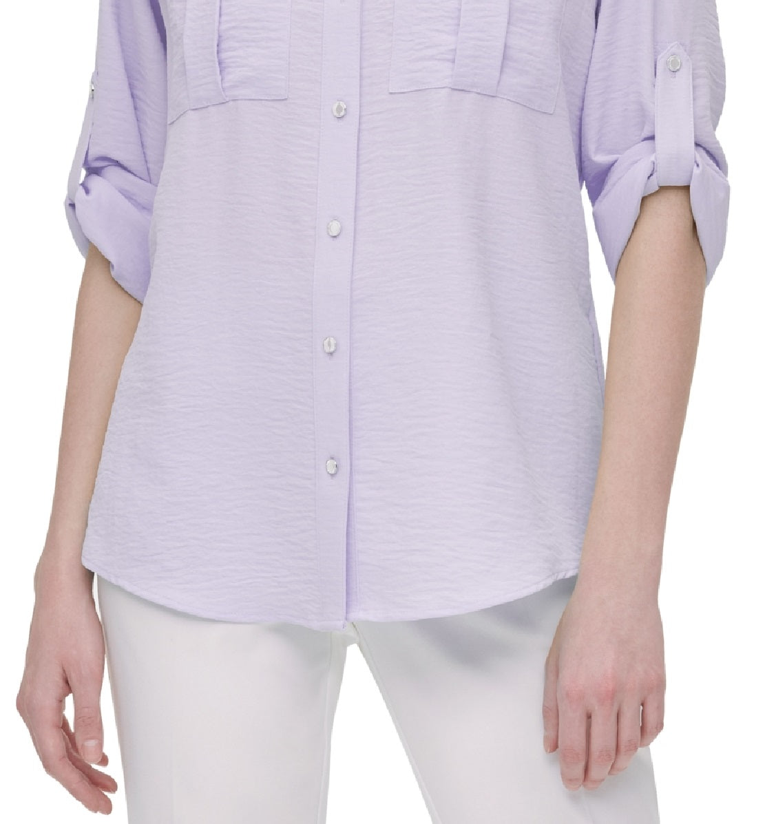 Calvin Klein's textured blouse is a fresh palette for you to build looks that speak to your own personal style. | Split neckline; front button closures| Buttoned flap pockets with box pleat at chest| Imported| Long sleeves with roll tabs| | Size & Fit