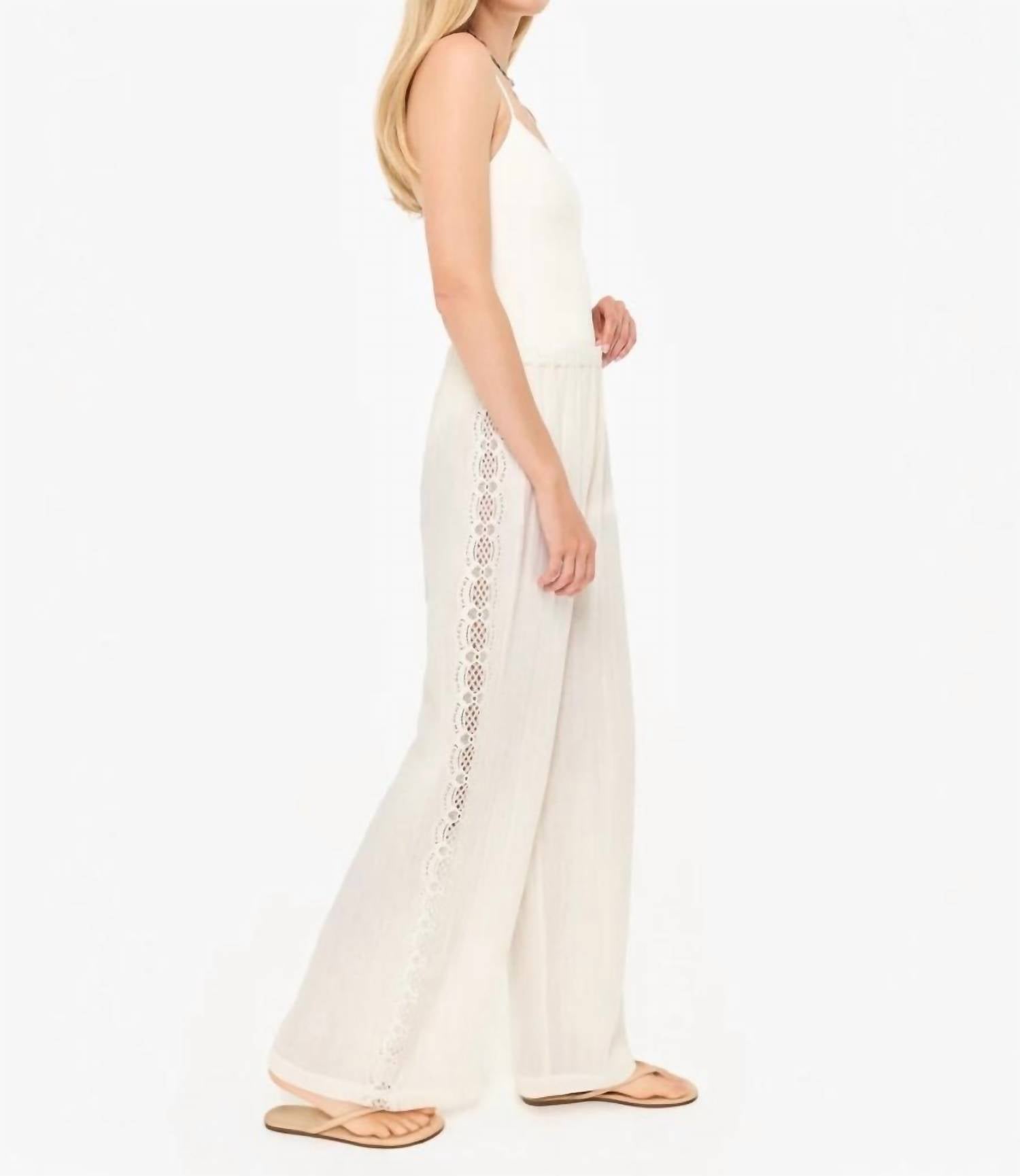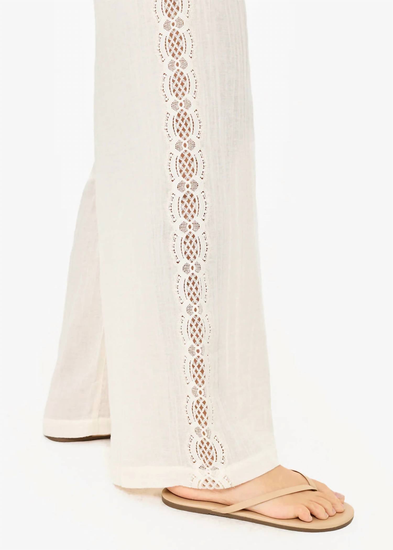 Experience effortless elegance with the Positano Pant by Cami NYC in a sophisticated macadamia hue. These wide-leg pants, crafted from 100% cotton double gauze, offer a relaxed fit with a mid-rise elasticated waist and sheer lace side details. Originating from international craftsmanship, these pants are fully unlined, making them a breathable choice for warm days. They require dry cleaning and steaming only to maintain their pristine texture.