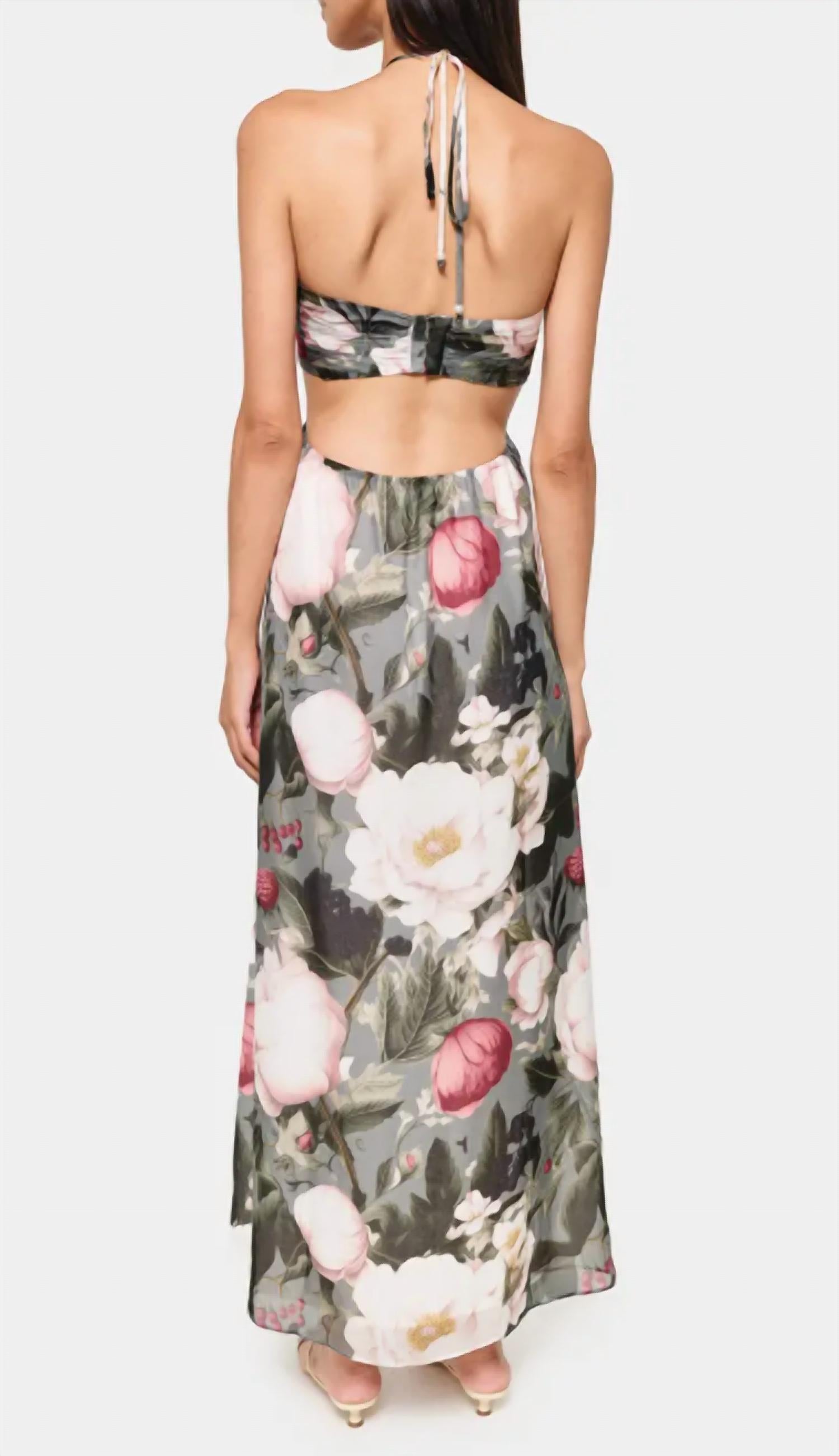 Embrace effortless summer elegance with the Women's Calliope Silk Dress by Cami NYC in the enchanting Bayou Bloom floral pattern. This sleeveless A-line maxi dress features a flowing silk composition and a flattering halter neckline, perfect for a beach day. Crafted for both comfort and style, it has a convenient tie closure for an adjustable fit. Although specific care instructions aren't provided, it's recommended to handle silk with care.