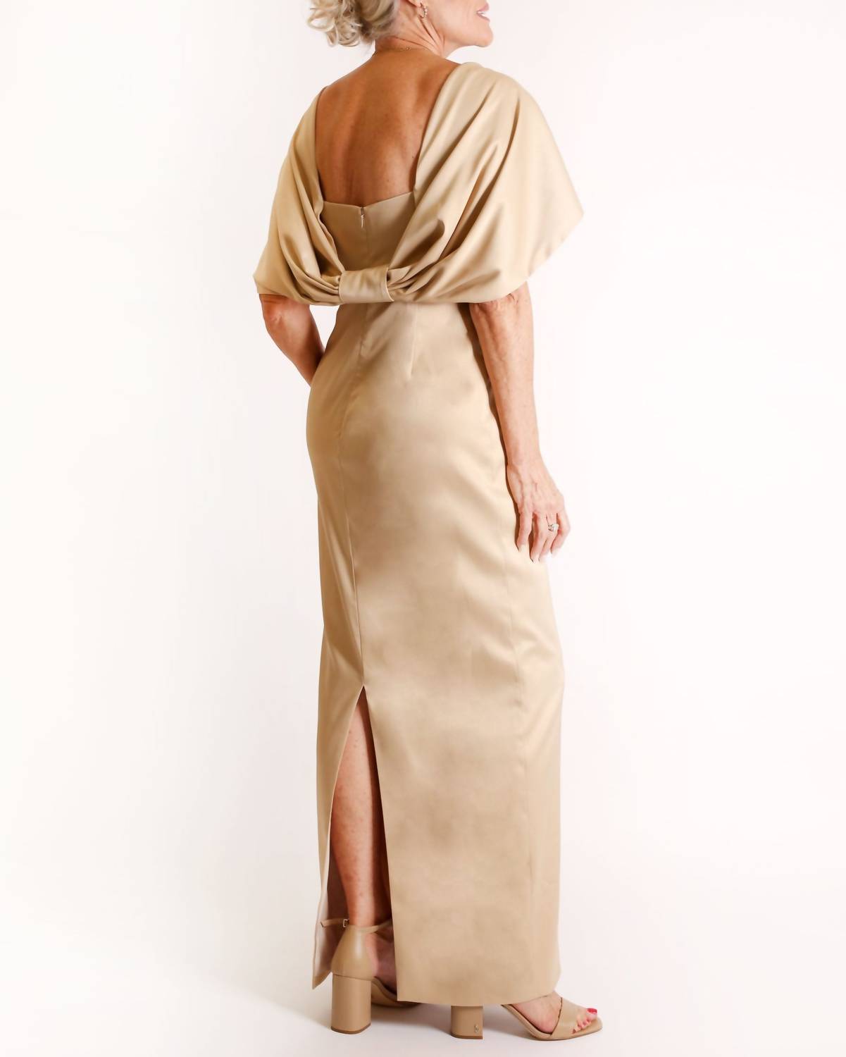 Style this maxi with your favorite statement necklace and sandals for the perfect look. Step into understated elegance with the Flora Gown by Camilyn Beth, a stunning choice in teal satin for any special occasion. Emphasizing an elegant sheath silhouette and short sleeves, this gown is crafted from luxurious stretch satin or peau de soie and designed in Florida, manufactured in NYC. The dress features a distinctive bow back detail, bra friendly, and an invisible zip closure for a chic and secure fit. Care instructions recommend dry clean only to maintain its exquisite fabric and finish.