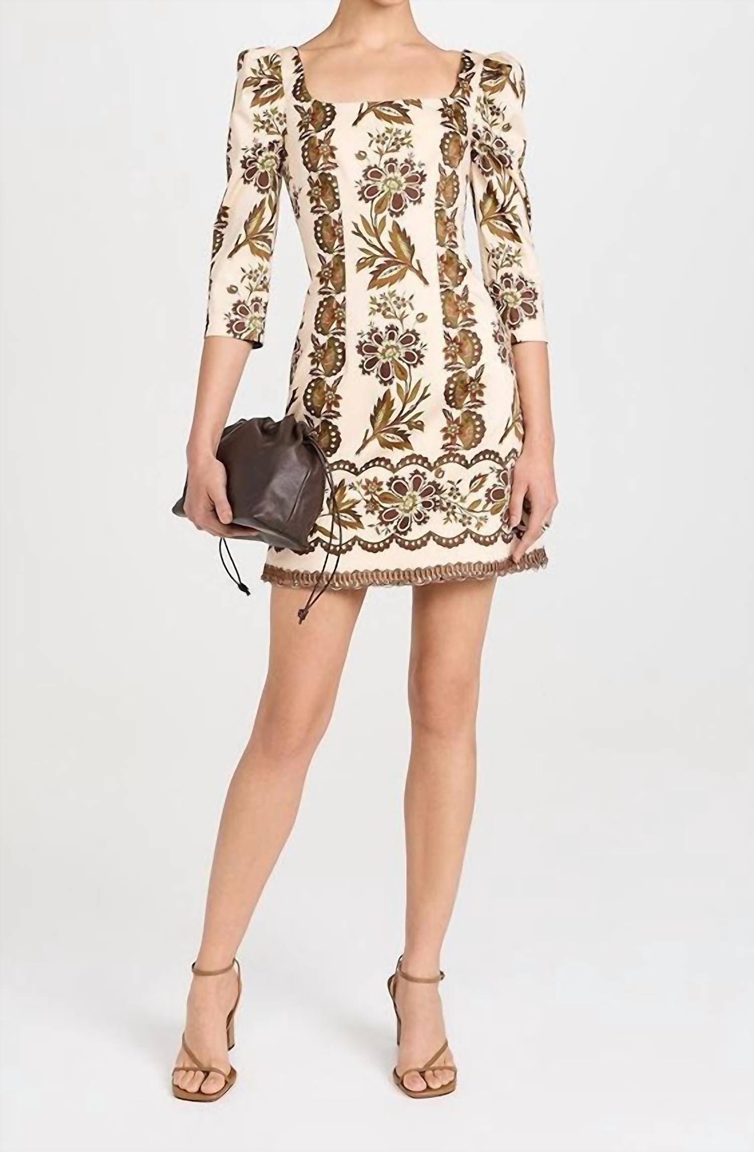 The kind of easy and flattering dress you'll be reaching for all season long. Introducing the Belinda Mini Dress by Cara Cara, a stunning piece for cocktail parties and Thanksgiving gatherings. Designed with a squareneck and three-quarter sleeves featuring puff shoulders, this mini-length sheath silhouette is crafted from a cotton blend with a mid-weight, low-stretch sateen poplin for a smooth, cool feel. The floral print and braided embroidery trim at the hem add a boho chic touch, while the pull-on closure ensures ease of wear. Composition: Shell - 97% cotton, 3% spandex; Lining - 100% polyester. Origin: Imported. Care: Dry clean only.