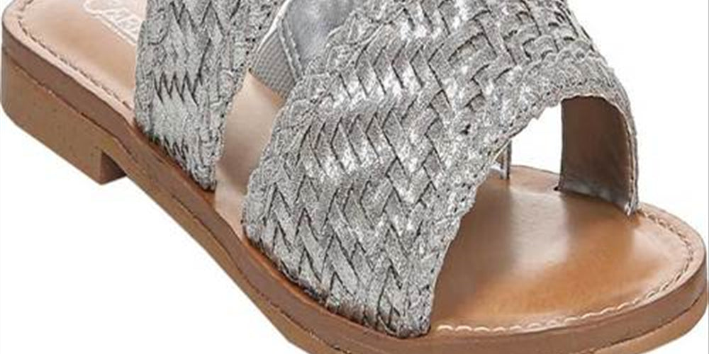 Round-toe sandals| Woven double asymmetrical straps at toe and vamp| Fabric or manmade uppers; manmade sole|