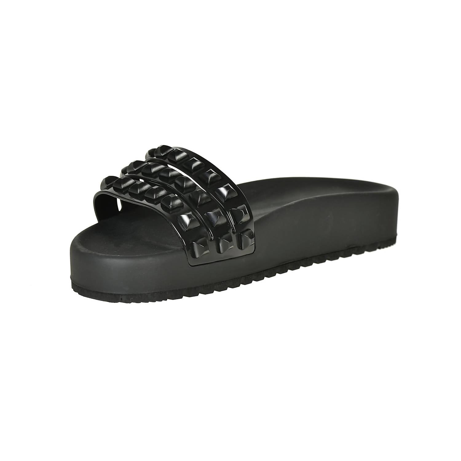 This sandal will take you from brunch to dinner and everything in between. Step out in style this summer with the Women's Franco 3 Strap Slides by CARMEN SOL, now updated with jumbo Borchia studs. Made in Italy, these slides feature three straps and a sleek round toe, crafted from high-quality Italian microlight PVC. Enjoy maximum comfort with an extra cushioned molded platform, perfect for a day at the beach.