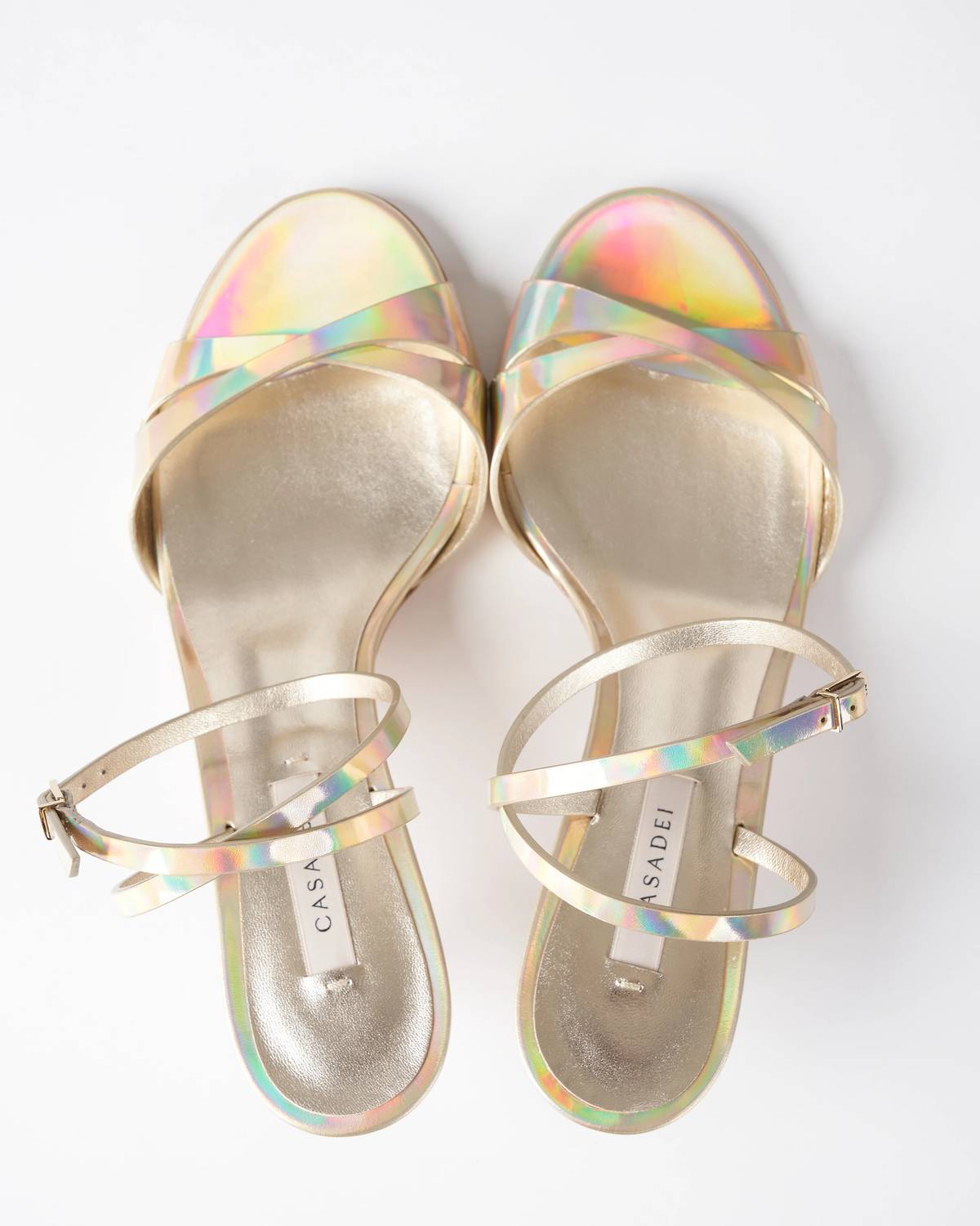 Pair these beauties with your favorite skinny jeans or dress for a night out on the town.Gold holographic sandal heels. Leather. Ankle strap with adjustable buckle. Almond toe. Heel height: 2.5". Made in Italy.