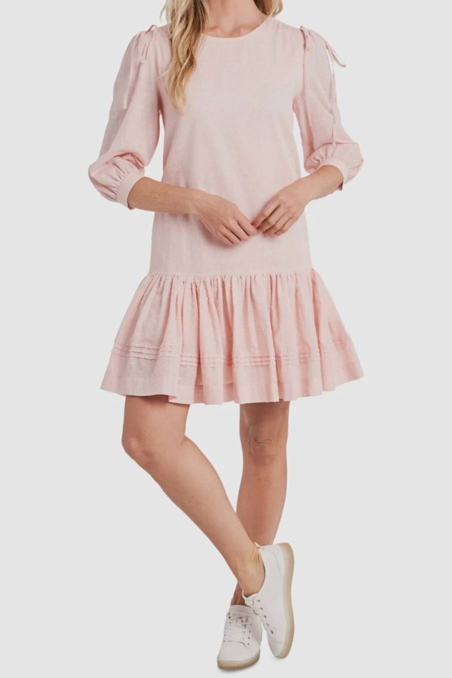 A short and breezy dress for those warmer days. Elevate your spring wardrobe with the CeCe Clip Dot Ruffled Dress in a charming pink shade. This mini dress features three-quarter sleeves and a flattering A-line silhouette with a crewneck design and ruffled hem. Composed of cotton and polyester, it is partially lined for comfort. With a button closure at the keyhole back, this imported dress is machine washable, offering both style and practicality. 100% Cotton.