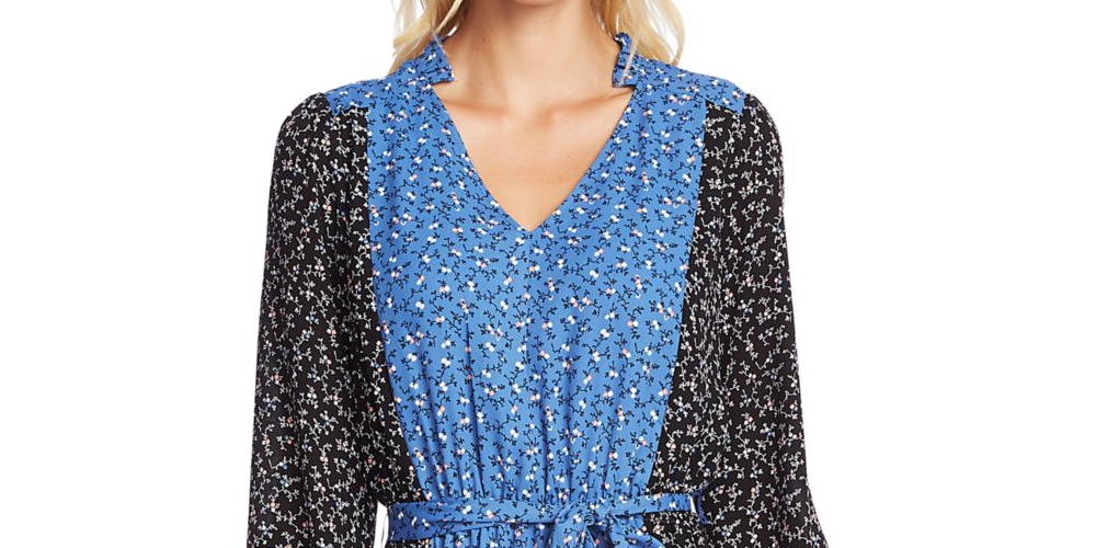 Cece Women's Belted Floral Long Sleeve V Neck Above the Knee Trapeze Dress Blue Size XL