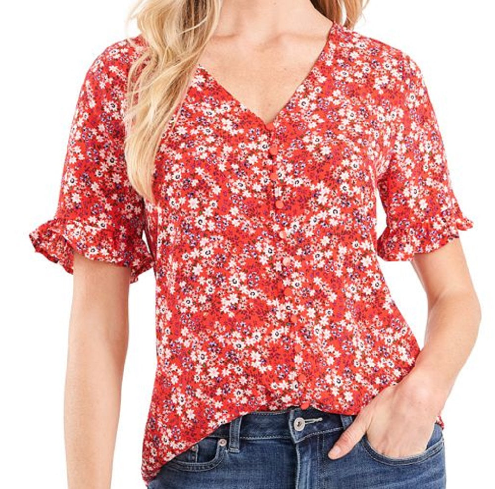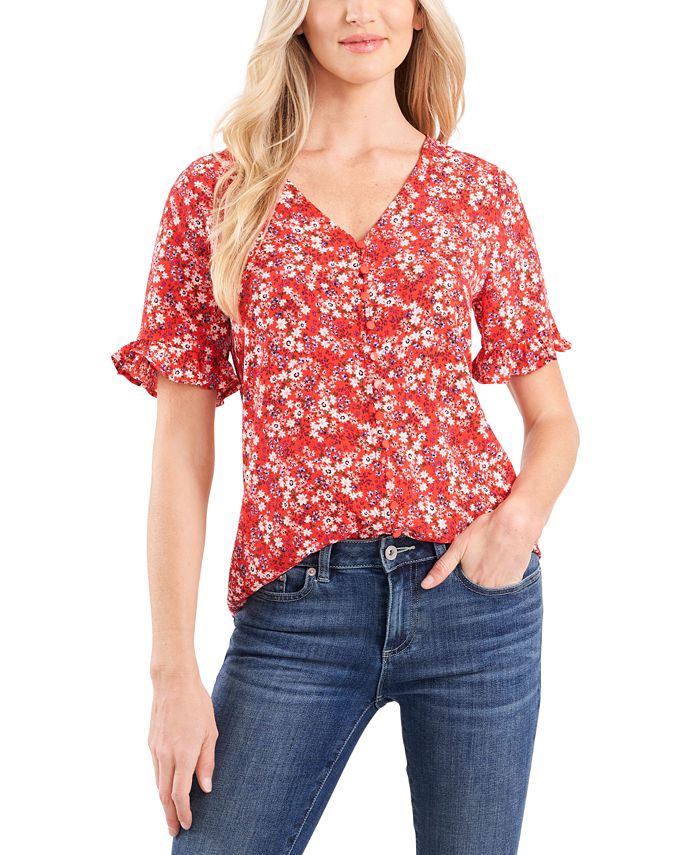 Dress up your fave pair of blue jeans with this fresh and flirty blouse by CeCe.| Printed; ruffled| Imported| V-neck; button-front closures| | Connect with a stylist & get free expert advice online or in stores for your wardrobe| home & more. Book Now
