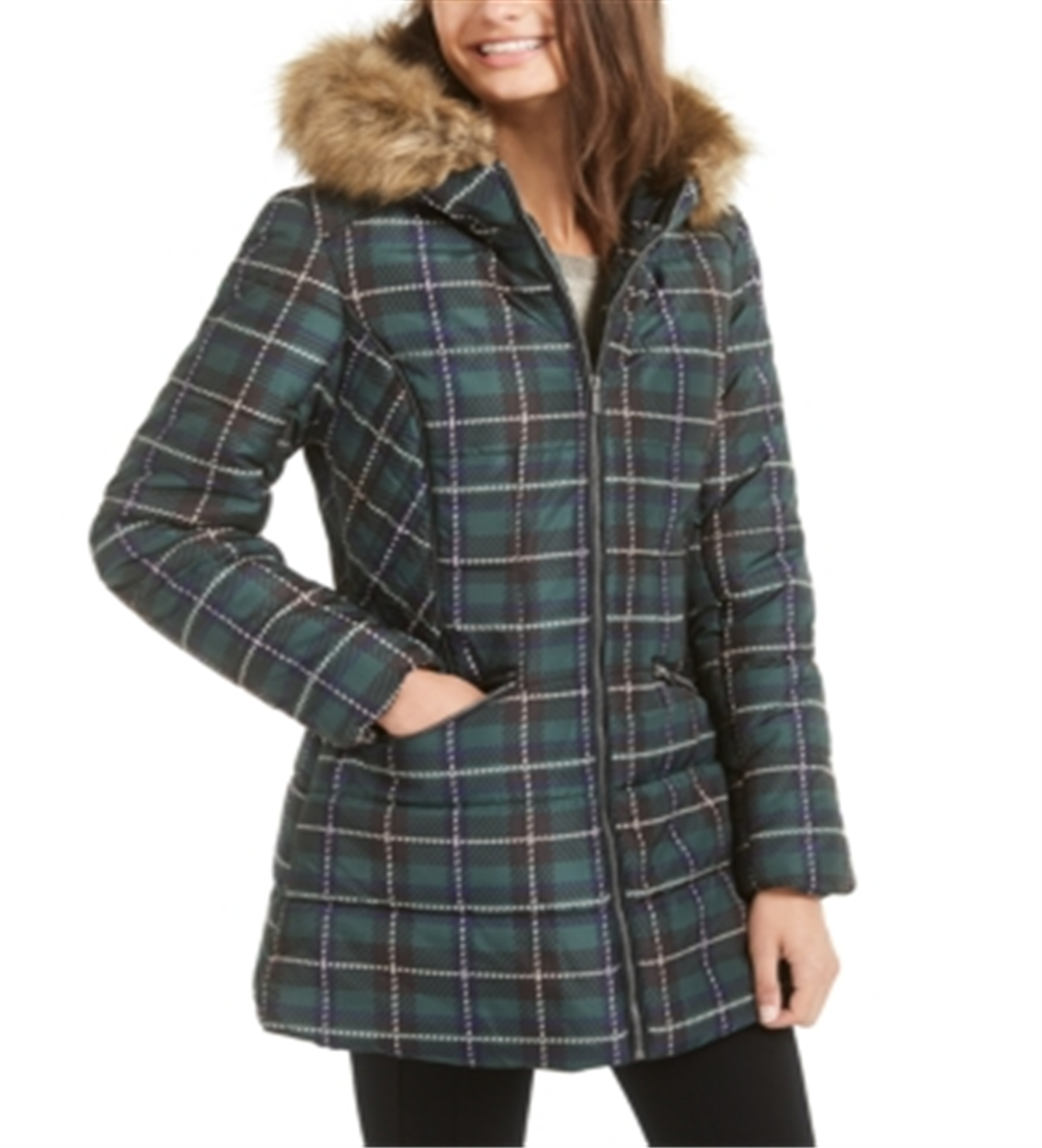 Celebrity Pink Women's Faux Fur Plaid Puffer Coat Green