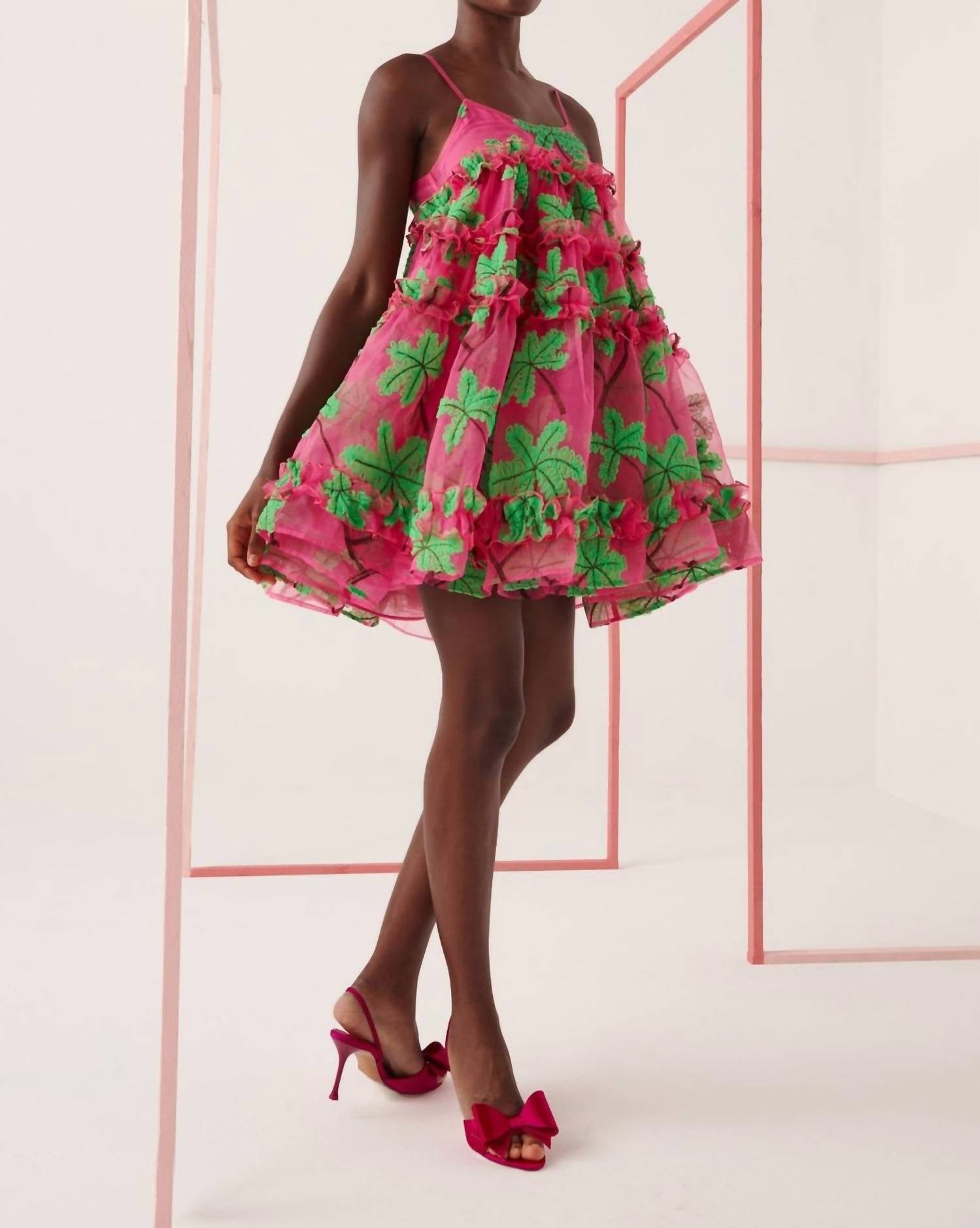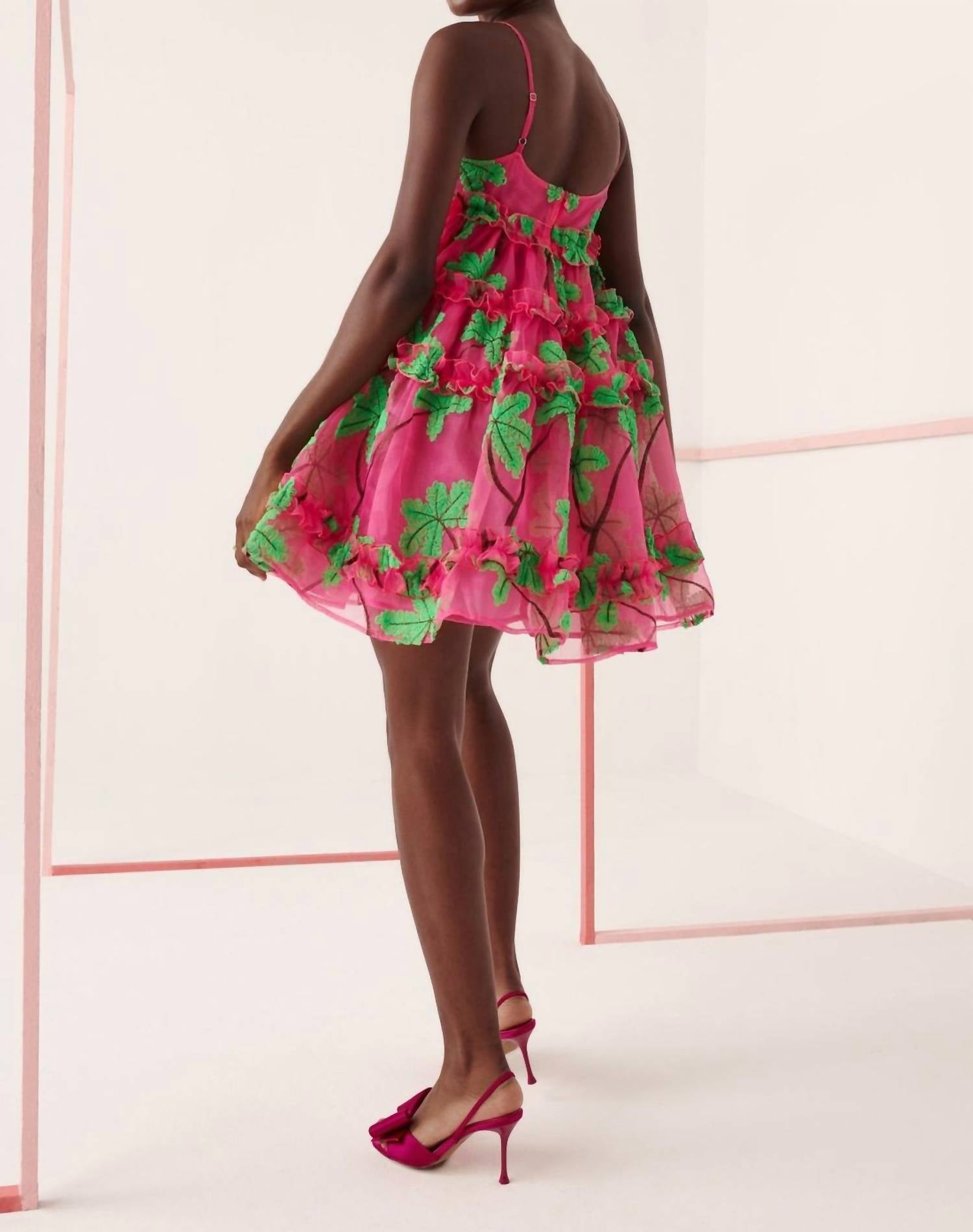 Meet the Ibiza Dress by CELiA B, a vivid cocktail party mini dress crafted for boho chic summer events. This playful piece features spaghetti straps and an A-line silhouette made from 95% polyester and 5% spandex, highlighted by its bold floral embroidery in vibrant green and neon pink on sheer fabric. Designed without pockets for a streamlined look, it closes securely with a zip closure. Care for this statement dress with dry clean only instructions to maintain its eye-catching appeal.