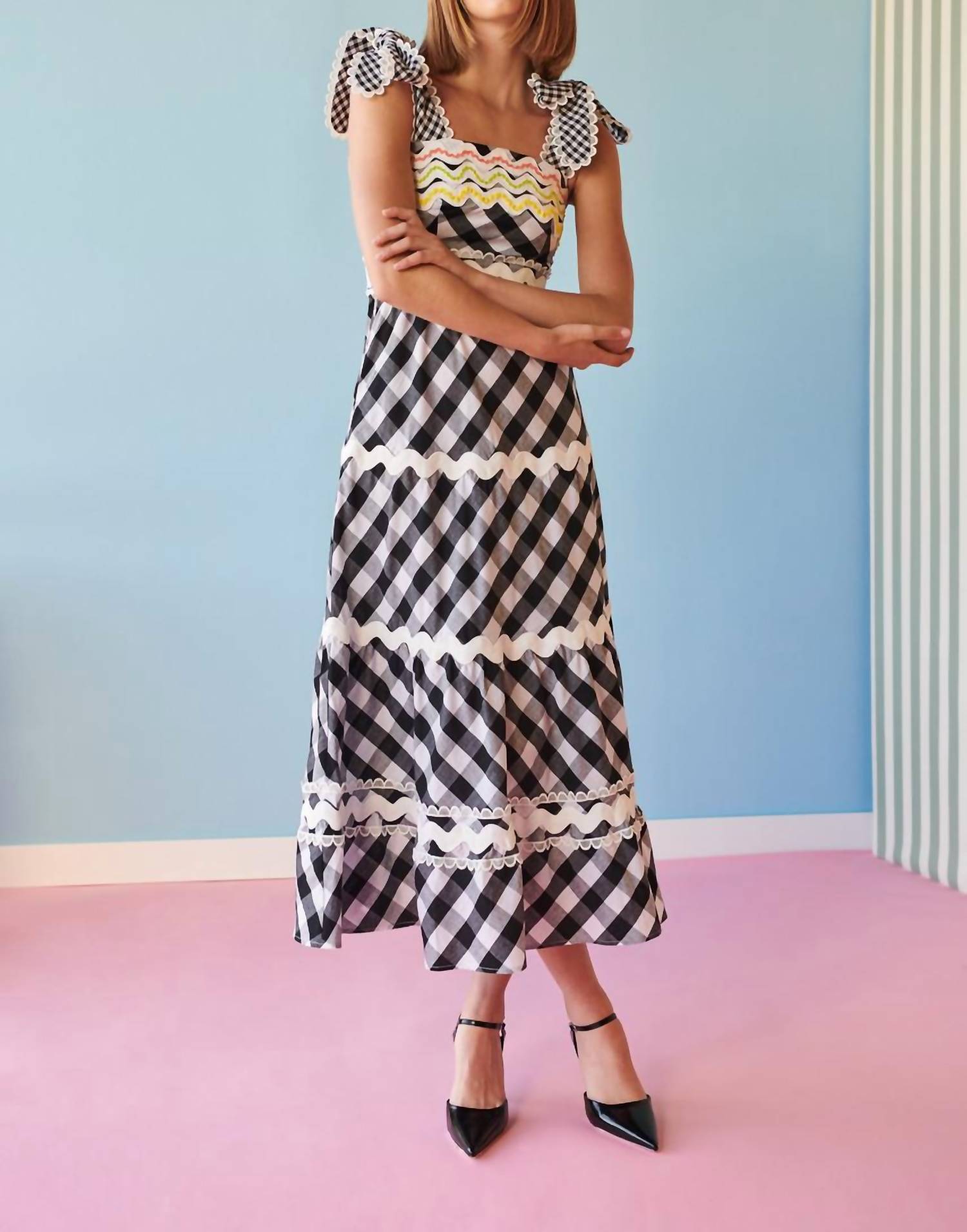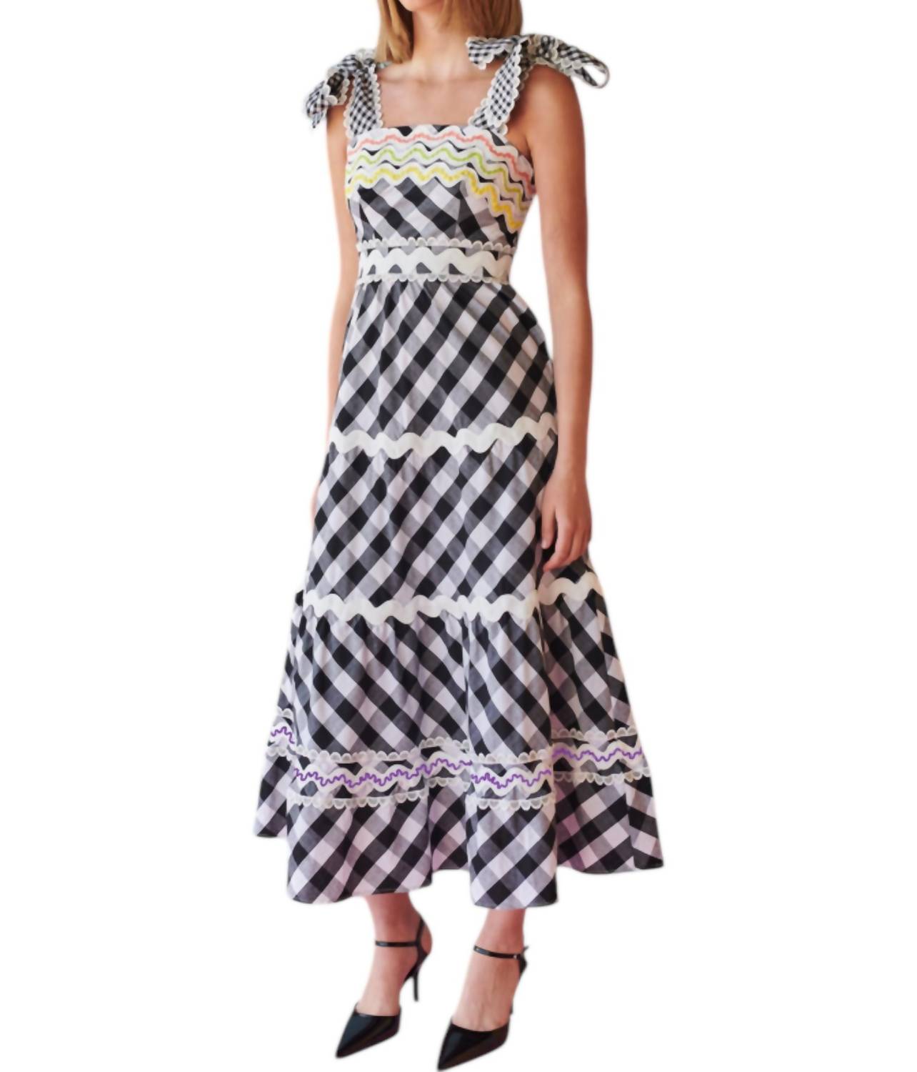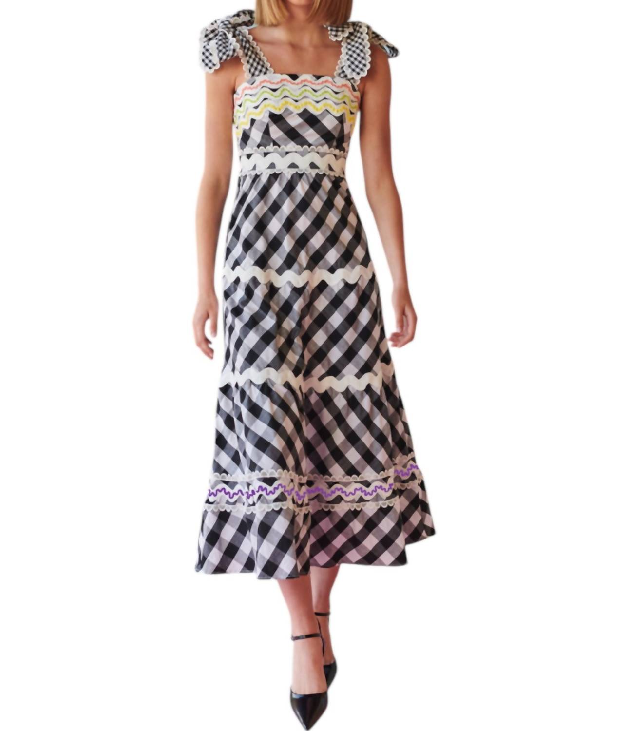 Who doesn't love a good maxi dress? This one you'll be reaching for season after season. Fresh, youthful and vibrant, this piece is your perfect ally for hot summer days! With a straight across neckline and thick straps that can be tied to your preference, this dress is as sweet as pie with its black and white gingham and our staple signature oversize ricrac trimes. Wide adjustable tie straps with sweet lace trims Classic A Line shape Fitted bodice Oversized ricrac detail Pockets Midi length hemline Back Zip. 100% Cotton.