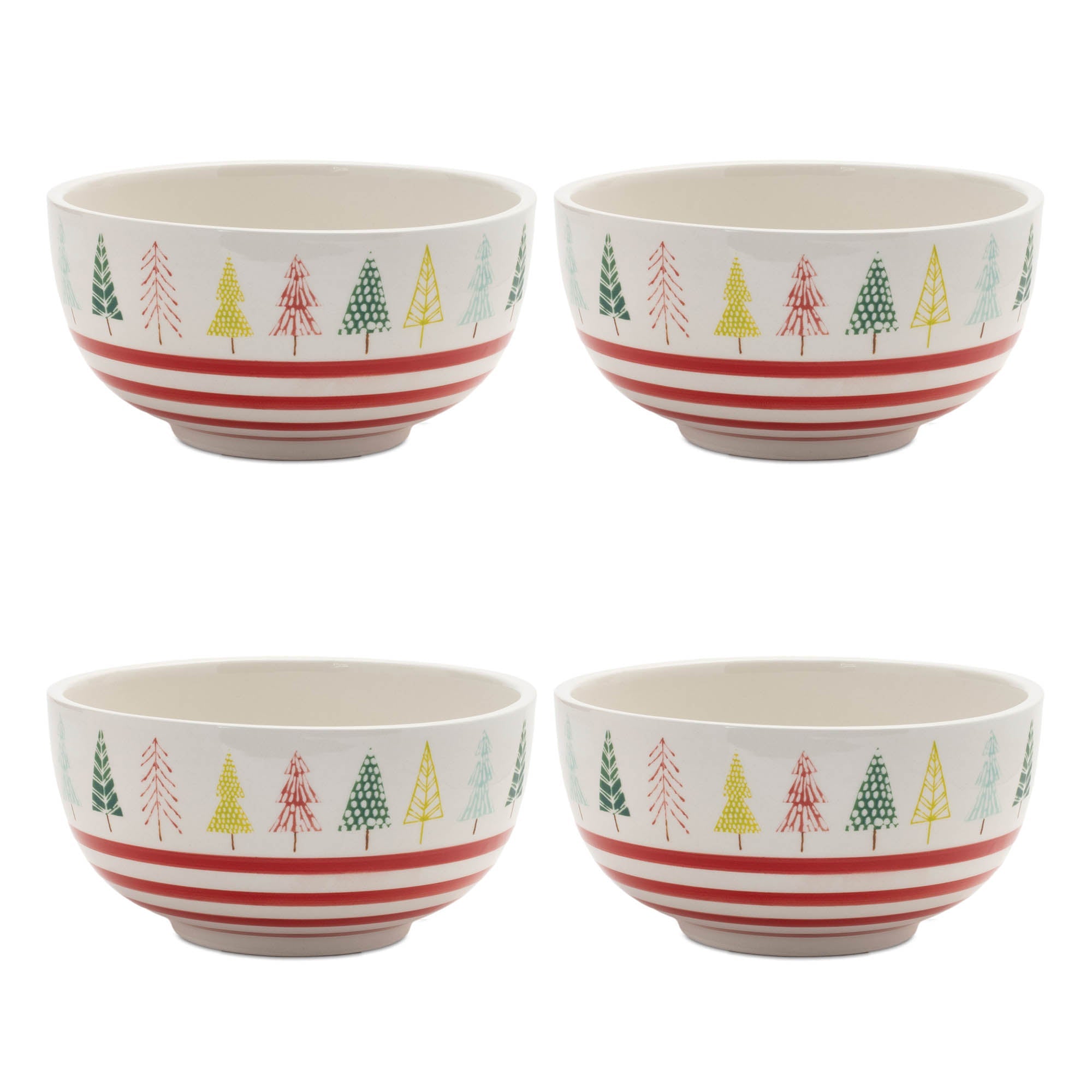Enhance your holiday entertaining with this Ceramic Pine Tree Print Bowl Set. Featuring modern pine tree artwork in festive red, green, and blue tones, these bowls are perfect for serving holiday treats. Whether you’re setting out cookies for Santa on Christmas night or filling them with sweet snacks for your guests, these charming bowls with a smooth glazed finish will bring a touch of seasonal cheer to your table. Sold in a set of four matching bowls, they are a delightful addition to your Christmas tabletop decor.