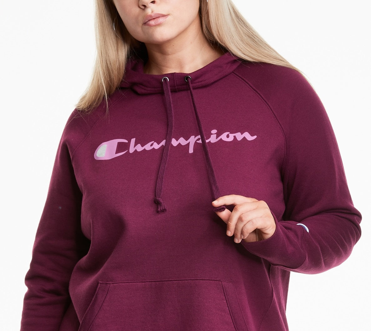 A script logo updates this go-to from Champion| a plus size hoodie with a hip-length silhouette for added coverage.| Hits at hip| INSPIRED FOR; Athleisure| Lined drawstring hood; kangaroo pocket; logo at front| Polyester/cotton| Machine washable