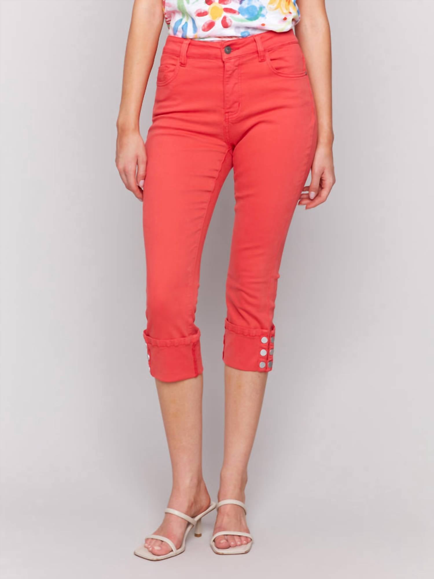 Comfortable and stylish, we love this cropped jean for all of the obvious reasons. Elevate your wardrobe with the Cropped Twill Jeans With Snap Button Cuff Detail by Charlie B, a vibrant choice in fiesta red. These slim-fit jeans boast a five-pocket design and snap button detail at the hem for a unique flair. Made from a cotton blend of 98% cotton and 2% spandex, they offer a comfortable stretch and a relaxed, mid-rise fit. Closure is ensured with a button, and care is a breeze with machine wash on a gentle setting followed by line drying and low iron if needed.