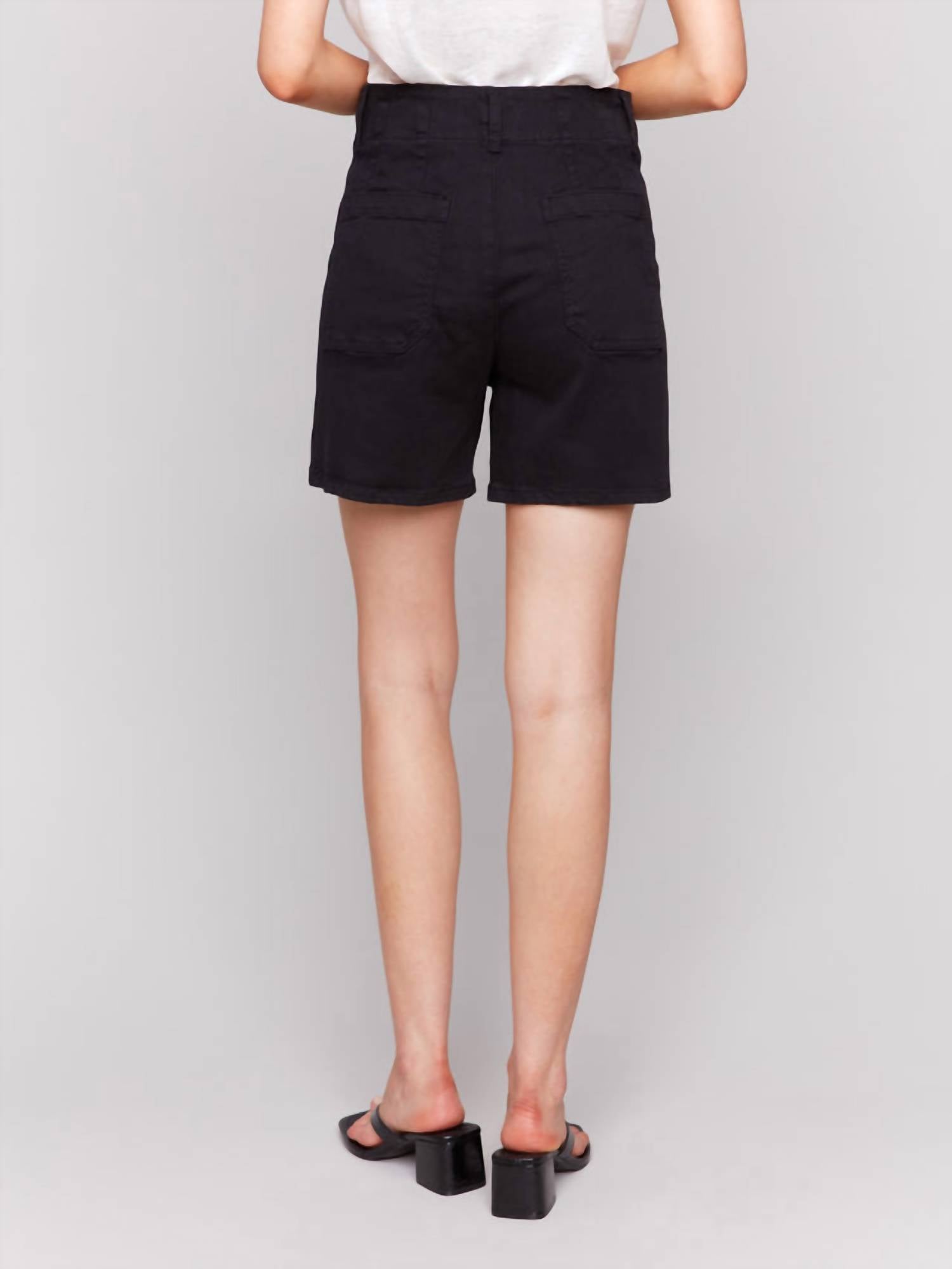 High-waist is here to stay and we especially love this style short. Experience the ultimate blend of comfort and style with the Front Patch Pocket Shorts by Charlie B. These black high-waist shorts are crafted from a 98% cotton and 2% spandex blend, offering super soft and stretchy wearability. Designed with four pockets, including two front patch pockets, and featuring a button and zipper closure, they are a perfect complement to any minimalist wardrobe. Care instructions advise machine washing in cold water and line drying. Jamie wears a size 6, while Ali showcases a size 12.