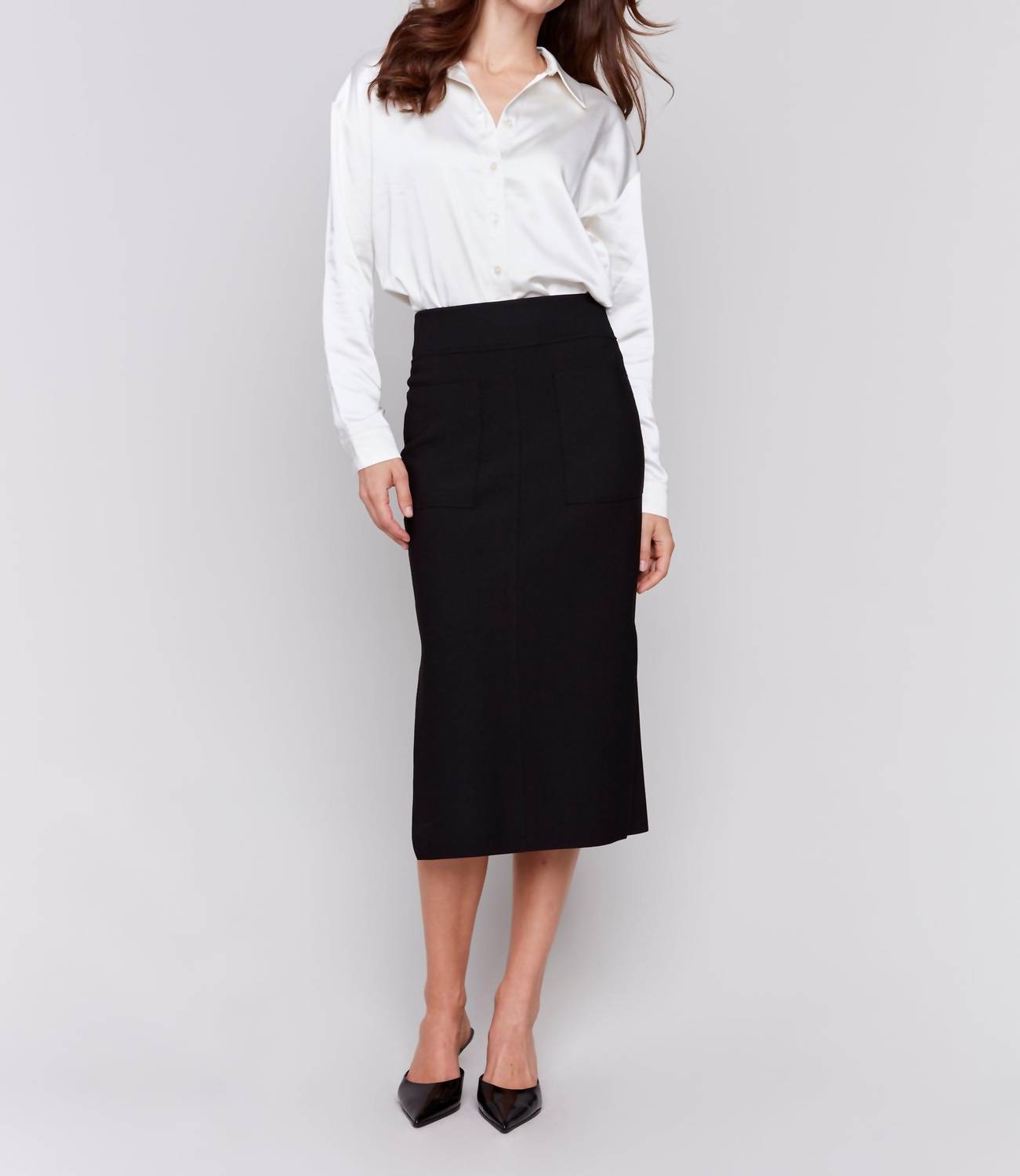 The midi length skirt is here to stay and we especially love this style. Introducing the Knee-length Skirt With Side Slits And Pockets by CHARLIE B, an essential piece for your workwear wardrobe in timeless black. This solid, knee-length skirt is crafted from a blend of 95% Polyester and 5% Spandex, featuring convenient pockets and a pull-on closure for easy wear. With a back length of 21 inches, this versatile midi skirt is perfect for a holiday party or fall gatherings. For optimal care, wash delicately in cold water, avoid bleach, lay flat to dry, and iron on a low setting.