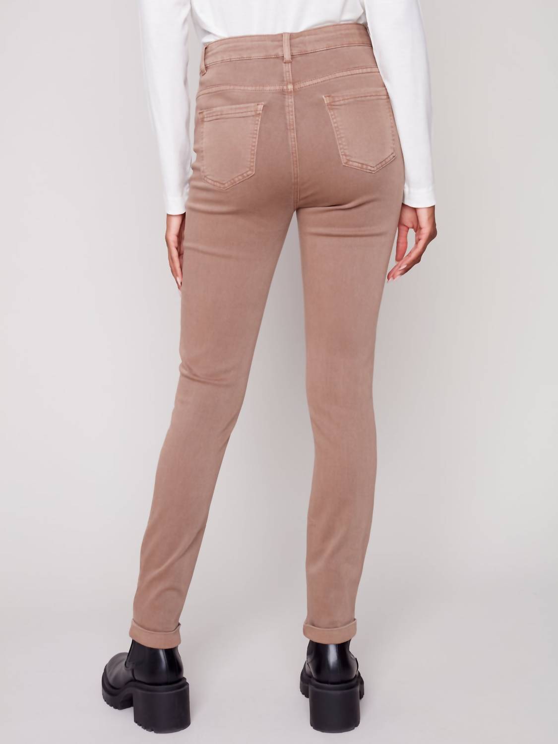 Everyone needs a good pair of skinny pants and this is a style you'll keep reaching for no matter the season. Embrace sophistication with the Twill Cuff Pant by CHARLIE B, a must-have for any discerning wardrobe. These high-rise, slim fit pants in a chic Truffle hue are crafted with a cotton blend comprising 49% Cotton, 45% Viscose, 5% Polyester, and 1% Spandex, offering comfort and style. They feature a skinny leg design with a button closure, perfect for a sleek silhouette. Care for these versatile pants with a machine wash and tumble dry, making them a practical addition for spring travel and beyond.