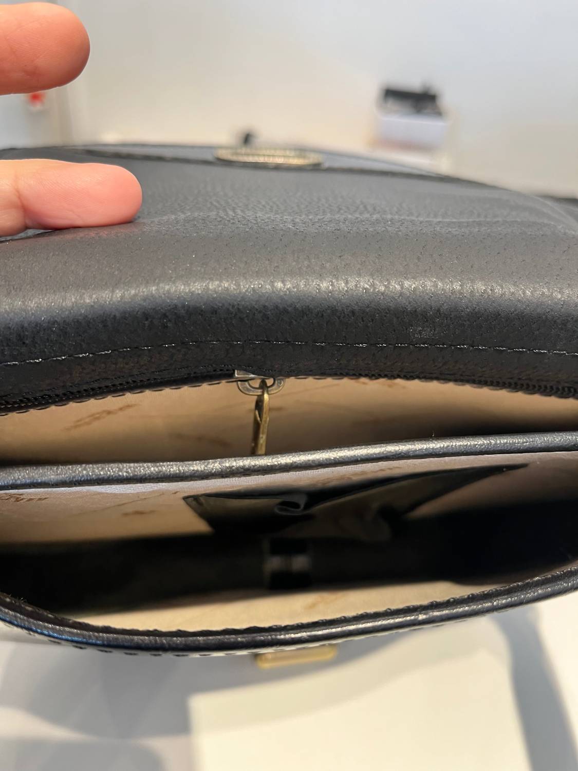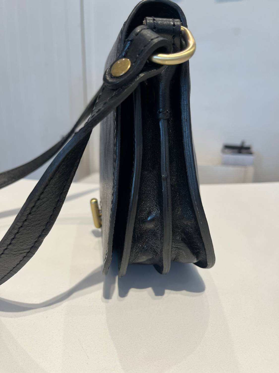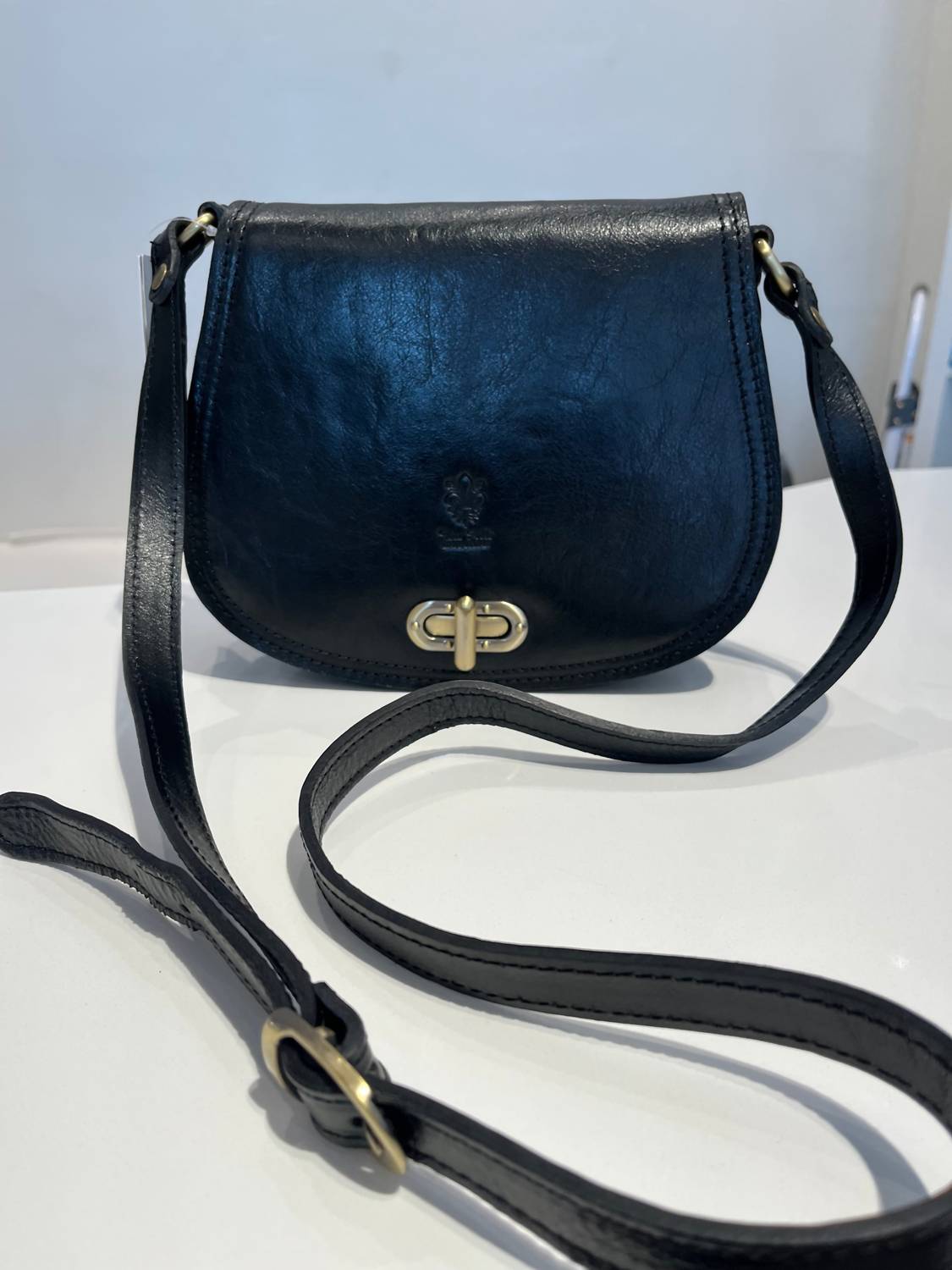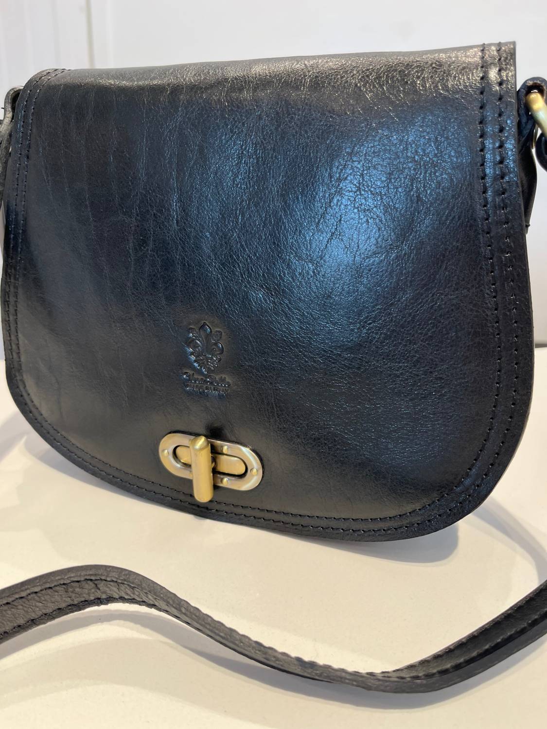 This crossbody bag will be your go-to bag of the season. Elevate your accessory game, crafted from high-quality Italian leather in classic black, featuring a durable leather strap and a secure metal latch closure. Offers multiple interior zippered compartments and pockets to keep your essentials organized. Dimensions: 7.5" height, 9.5" width, and 3" depth.