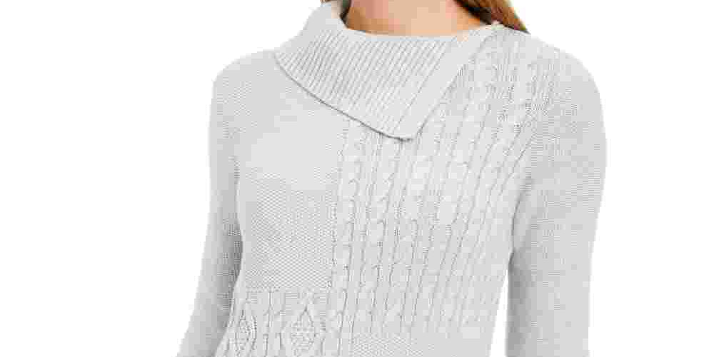 Relaxed fit; approx. 25 long|Designed to fit and flatter 5'4 and under frame|Envelope neckline|Cable-knit detail at front; ribbed at edges; vented hem|Cotton/nylon/acrylic