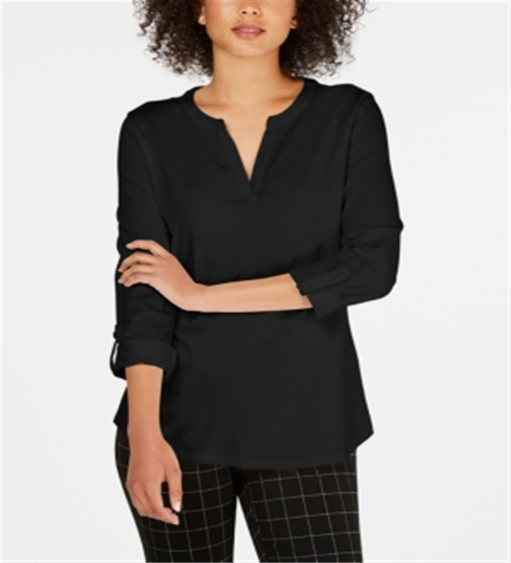 Charter Club Women's Petite Supima Cotton Split-Neck Top Black Size Petite S