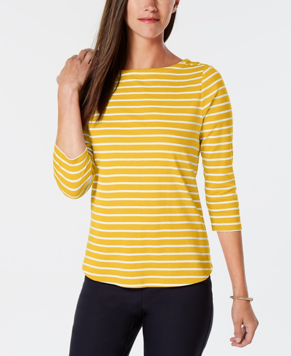 Charter Club Women's Pima Cotton Button Shoulder Print Top Gold Size Petite Medium