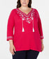 Relaxed fit; hits below hip; approx. 31" long|Scoop neckline with keyhole and tassel tie|Embroidered at neckline and cuffs|3/4-sleeves