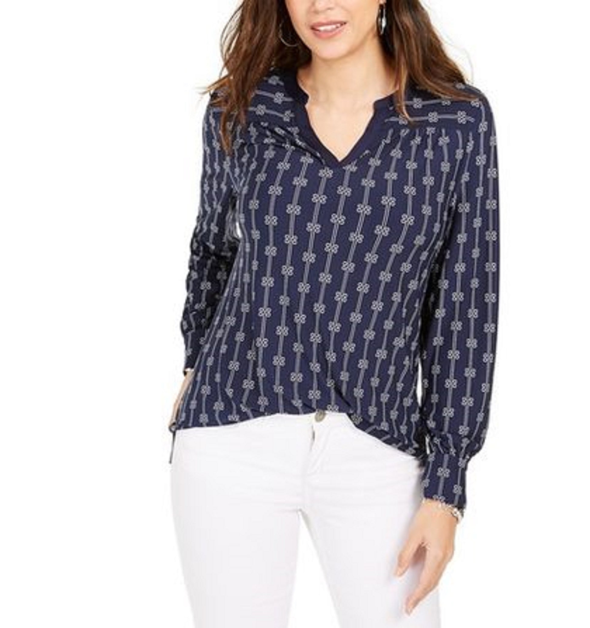 Ask a question about Charter Club Women's Printed Split-Neck Top Blue Size Small