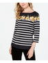 Charter Club Women's Stretch Button detail Floral 3/4 Sleeve Boat Neck Top Black Size Petite X-Large