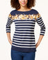 Charter Club caps nautical stripes with a floral-print garland in this fresh knit top| finished with buttons at the left shoulder.| Relaxed fit; hits at hip; approx. 26 long| Due to generous sizing| we suggest sizing down for the perfect fit| Boat neckline
