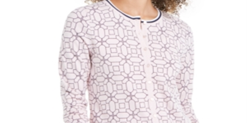 Karen Scott's timeless cardigan sweater gets a stylish update with contemporary geometric patterning and classic tipped trim.| Approx. model measurements: height: 5'10"; bust: 35.5"; waist: 27"; hips: 35"| Relaxed fit; hits at hip; approx. 23-1/2" long| Due to generous sizing, we suggest sizing down for the perfect fit| Round neckline; button-front closure| Duotone tipped trim at neckline, cuffs and ribbed hemline band| Long sleeves with ribbed cuffs| Rayon/nylon| Machine washable| Imported