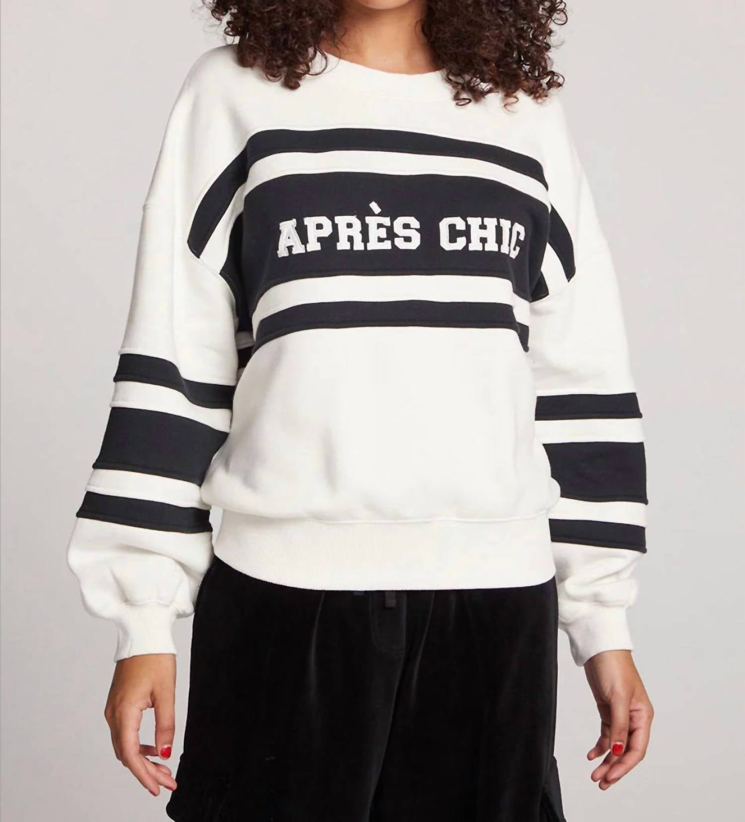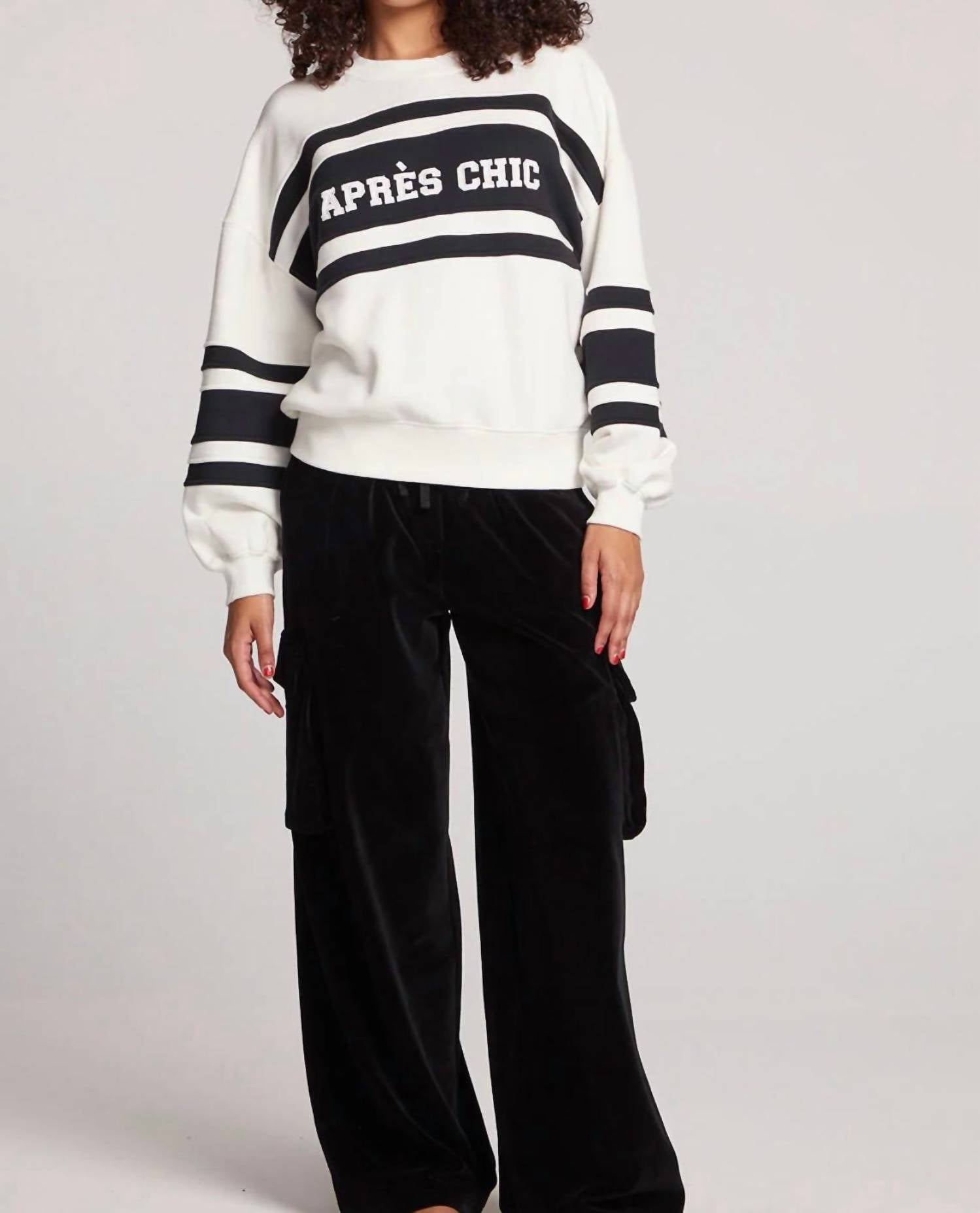 Elevate your fall wardrobe with the Apres Chic Colorblock Pullover Sweater by Chaser, a stylish choice for travel or casual occasions. This women's pullover features long gigot sleeves and a striking black and white colorblock pattern with a cheeky graphic message that captures attention. Crafted from 100% cotton, this comfortable crewneck sweater offers a fitted silhouette and a pull-on closure for easy wear. Imported for superior quality, it is designed to be machine washed and laid flat to dry, making it a practical yet chic addition to any closet. Model is 5'9" and wears a size small.