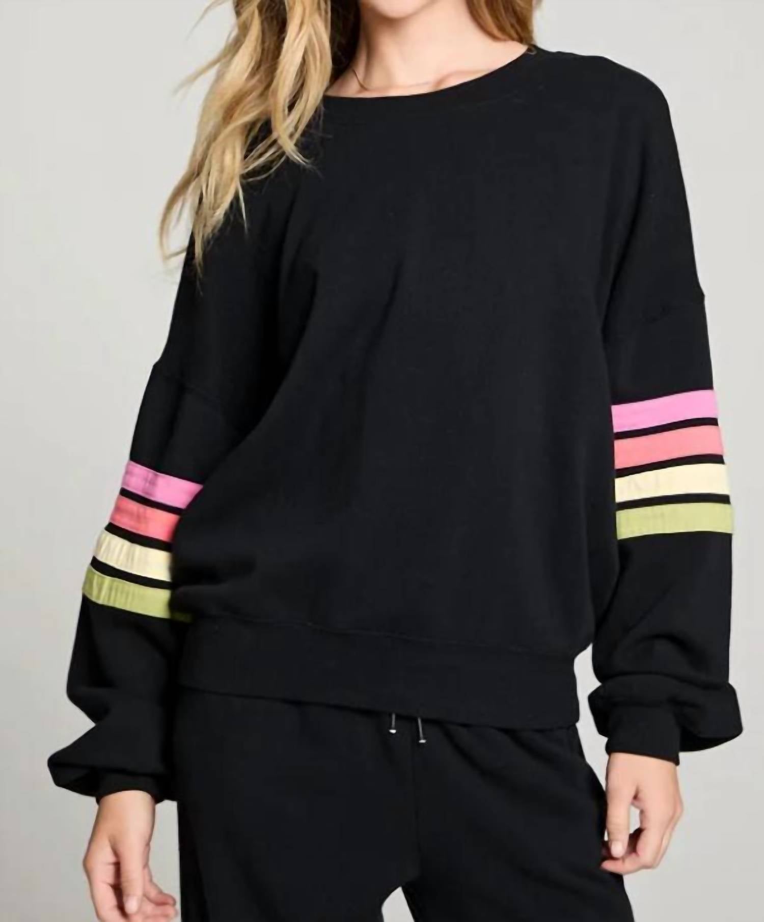 Cooler temps call for layering and we love this adorable sweatshirt for all the obvious reasons. Get ready to turn heads with this Rainbow Strappings Long Sleeve Pullover! The bold colorful stripes against a black backdrop give a fun 80s vibe. Not only is it roomy and comfortable, but it's also versatile enough to wear out or to your favorite workout class. Fabric Content: 100% Cotton