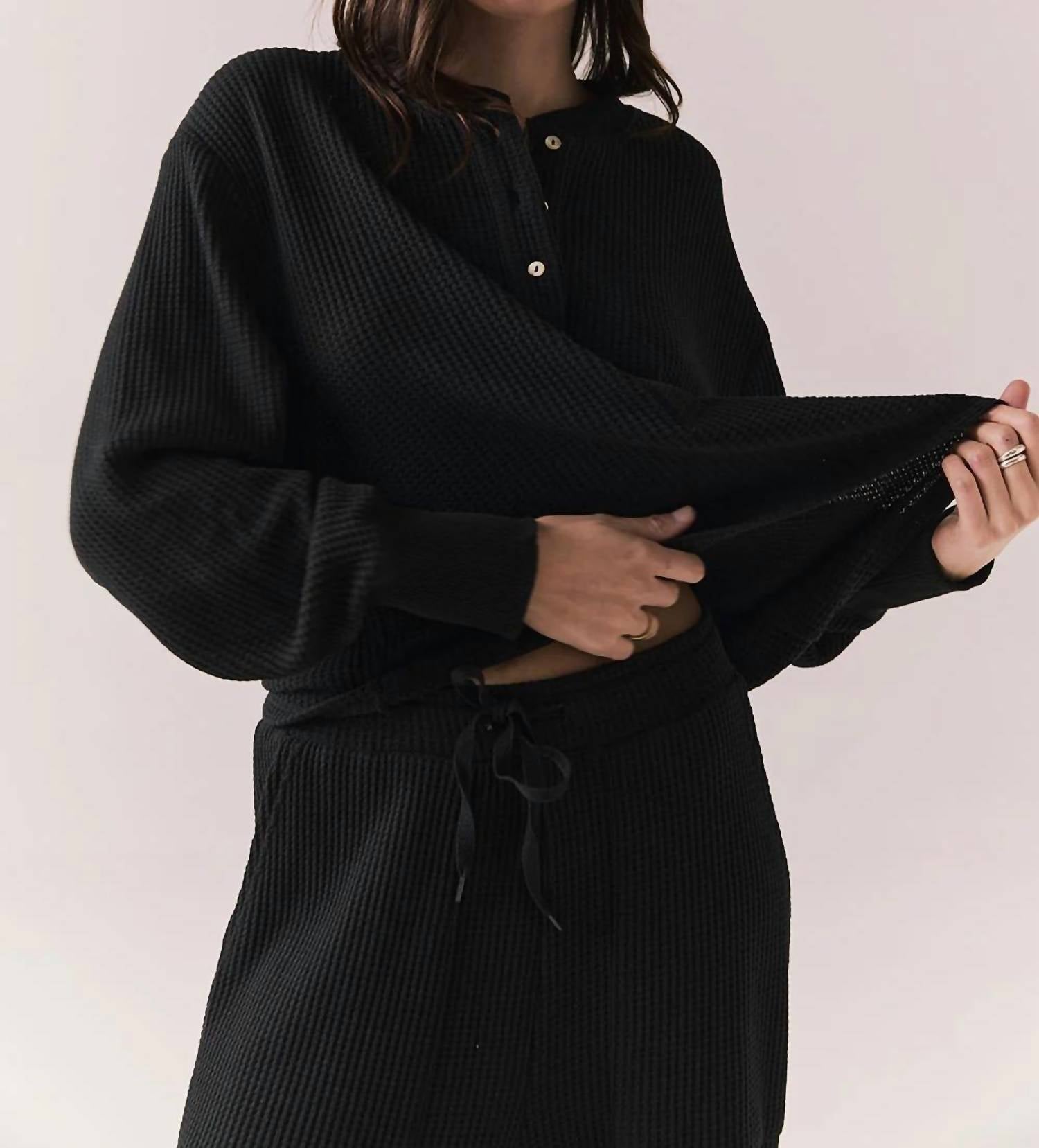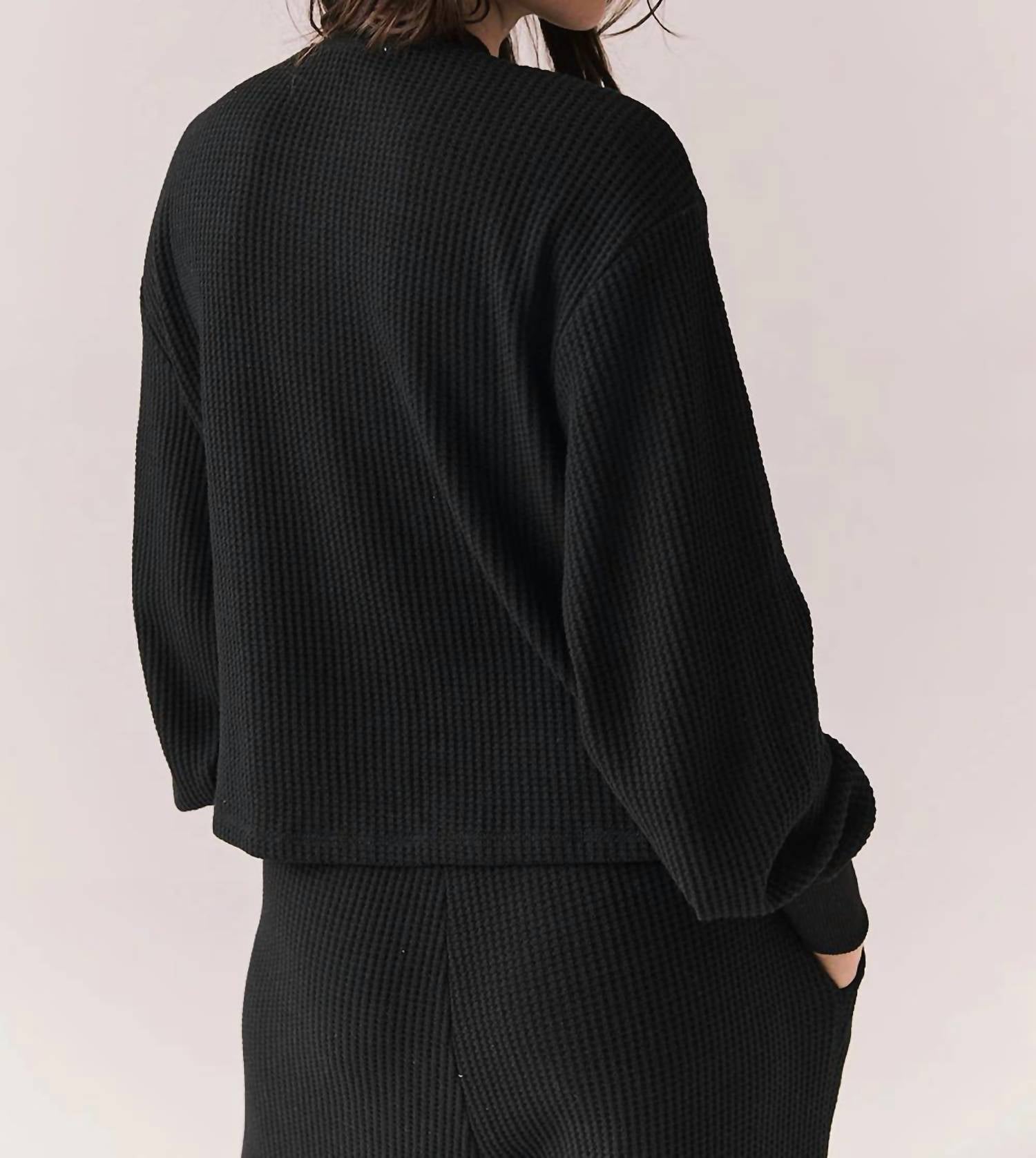 A long sleeve top you can wear with denim, skirts, well... just about anything! Embrace effortless style with the Thayne Long Sleeve by Chaser in True Black, a chic addition to your summer wardrobe. This women's top features a long sleeve with a henley-style button closure and a cropped, boxy fit, offering a blend of sophistication and comfort. Made from a soft cotton blend of 63% Polyester, 33% Cotton, and 5% Spandex, its textured pattern is perfect for both vacation and everyday wear. Proudly imported, this versatile piece can be machine washed and tumble dried for easy care. The model, standing at 5'9", wears a size small.
