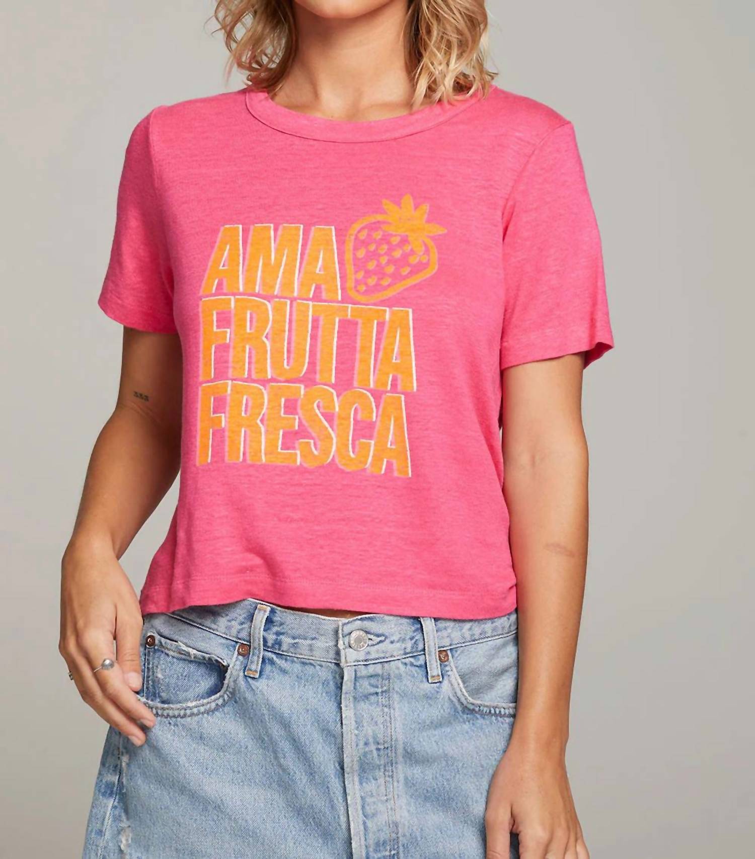 Embrace summer in the Chaser Women's Frutta Fresca Top, a vibrant raspberry linen blend tee. With its short sleeves and cropped length, this graphic tee celebrates fresh fruit in Italian, adding a touch of culture to your casual collection. Composition: 97% Linen, 3% Spandex. Closure: Pull On. Care: Wash cold with like colors, lay flat to dry. Model is 5'9" and wears a size small.