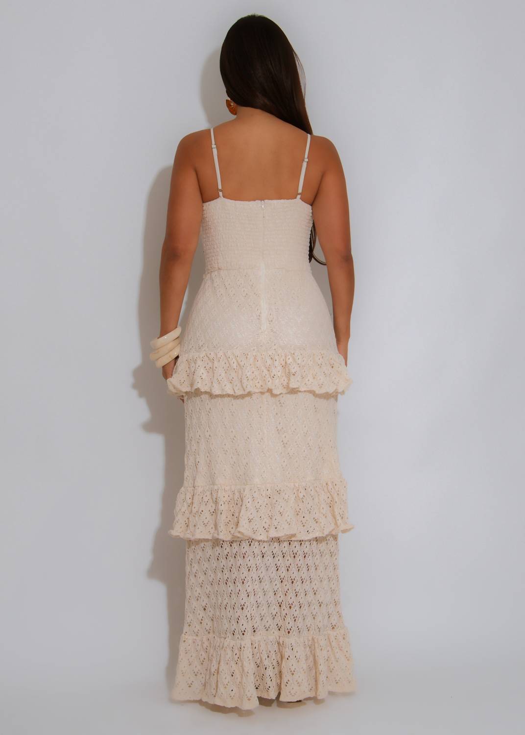 Who doesn't love a good maxi dress? This one you'll be reaching for season after season. Chicways' Cabana Muse Crochet Ruched Maxi Dress is a captivating addition to your summer wardrobe. This women's nude dress features delicate spaghetti straps and a sweetheart neckline, accentuating its boho-chic appeal. Crafted from 100% polyester, it boasts intricate crochet patterns, sculpted ruching, and stunning cutouts, flowing into cascading ruffles for an enchanting look. Closure: Back zip closure. Care: Machine wash and lay flat to dry.