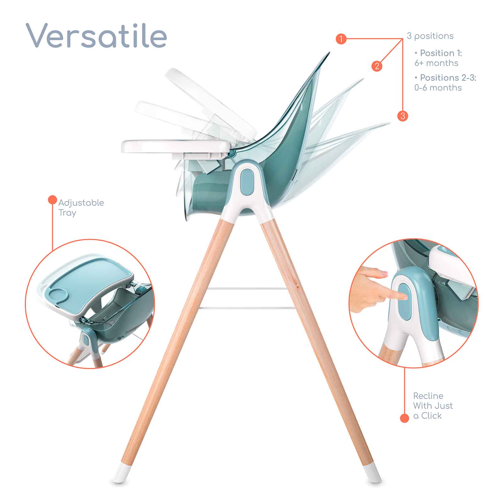 The removable tray and legs make it easy for this high chair to change to your growing child. Our design allows for you to use this from ages 6 months to 6 years old as a high chair, booster seat, or kids chair. The chair comes with three reclining levels, so you are able to adjust as your child gets older. - SAFETY FIRST