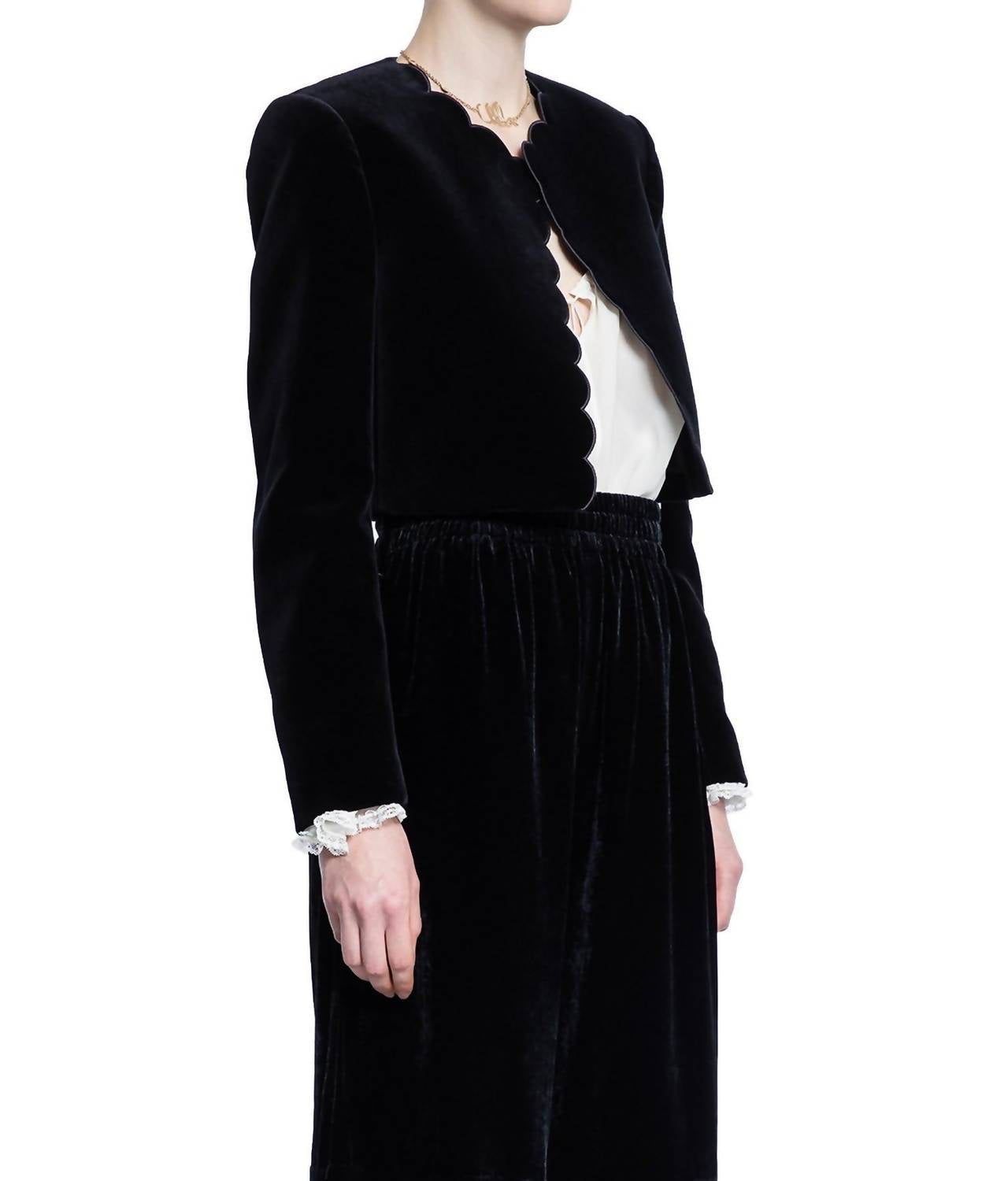 Discover the Velvet Scalloped Jacket by Chloe, a statement piece in sophisticated black. With its elegant long sleeves and 100% cotton velvet composition, this jacket features a luxurious silk lining and a beautifully embroidered scallop trim. Made in Italy, it boasts an open front design and a chic cropped hem, perfect for adding a touch of sophistication to your workwear wardrobe. Care for this fitted piece by opting for dry cleaning only.