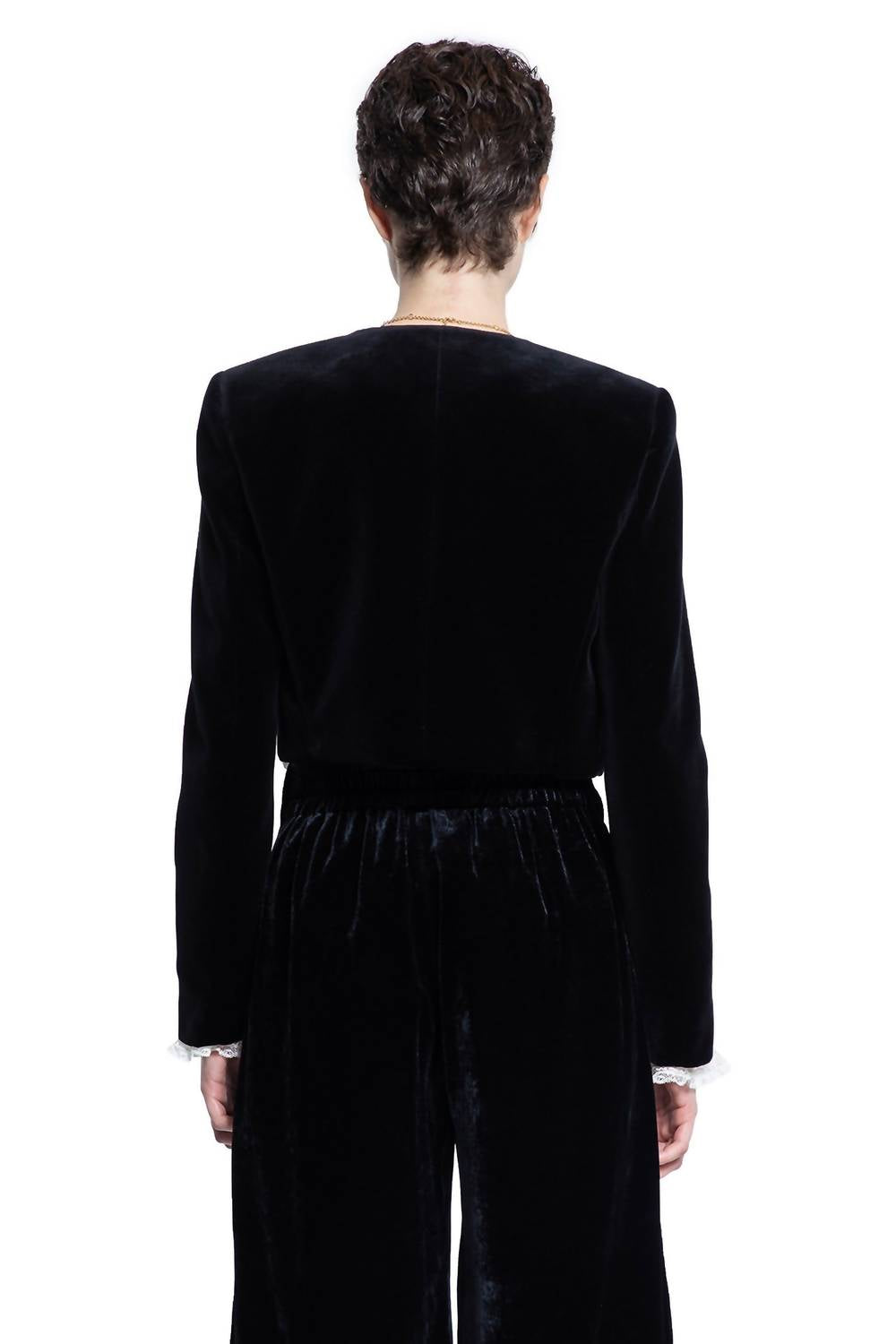 Tailored to perfection, this blazer will be your go-to jacket for years to come. Discover the Velvet Scalloped Jacket by Chloe, a statement piece in sophisticated black. With its elegant long sleeves and 100% cotton velvet composition, this jacket features a luxurious silk lining and a beautifully embroidered scallop trim. Made in Italy, it boasts an open front design and a chic cropped hem, perfect for adding a touch of sophistication to your workwear wardrobe. Care for this fitted piece by opting for dry cleaning only.