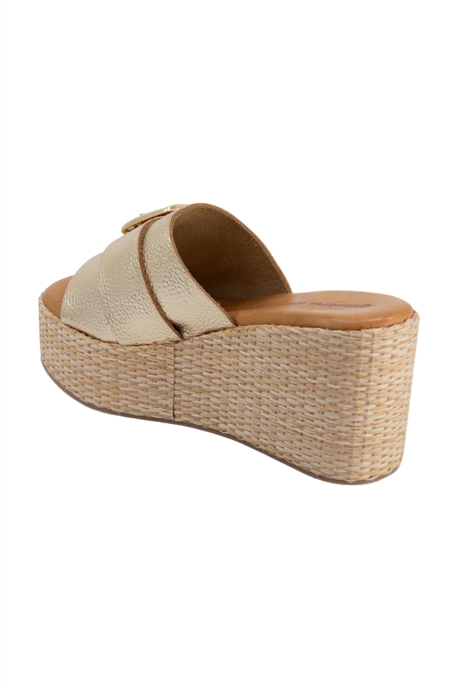 This sandal will take you from brunch to dinner and everything in between. Meet the Jana Sandal by CHOCOLAT BLU, a show-stopping addition to your collection, perfect for any Summer wardrobe. Crafted for style and comfort, these gold platform wedge slides feature a leather upper and lining, a decorative buckle, and boast a 3 1/4" heel with a 1 5/8" platform height. Made in Italy, these sandals provide walking ease with a padded footbed and durable rubber outsole. Ideal for maximalist trends and holiday parties, enjoy the elegance of the open toe design.