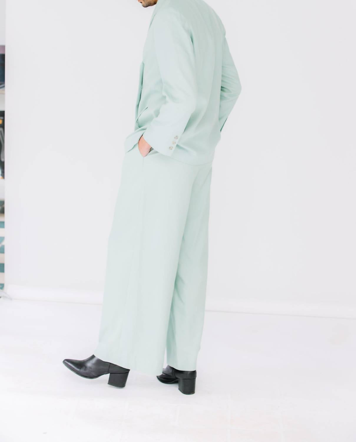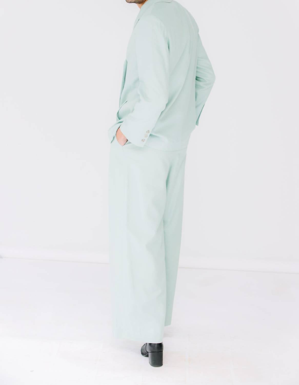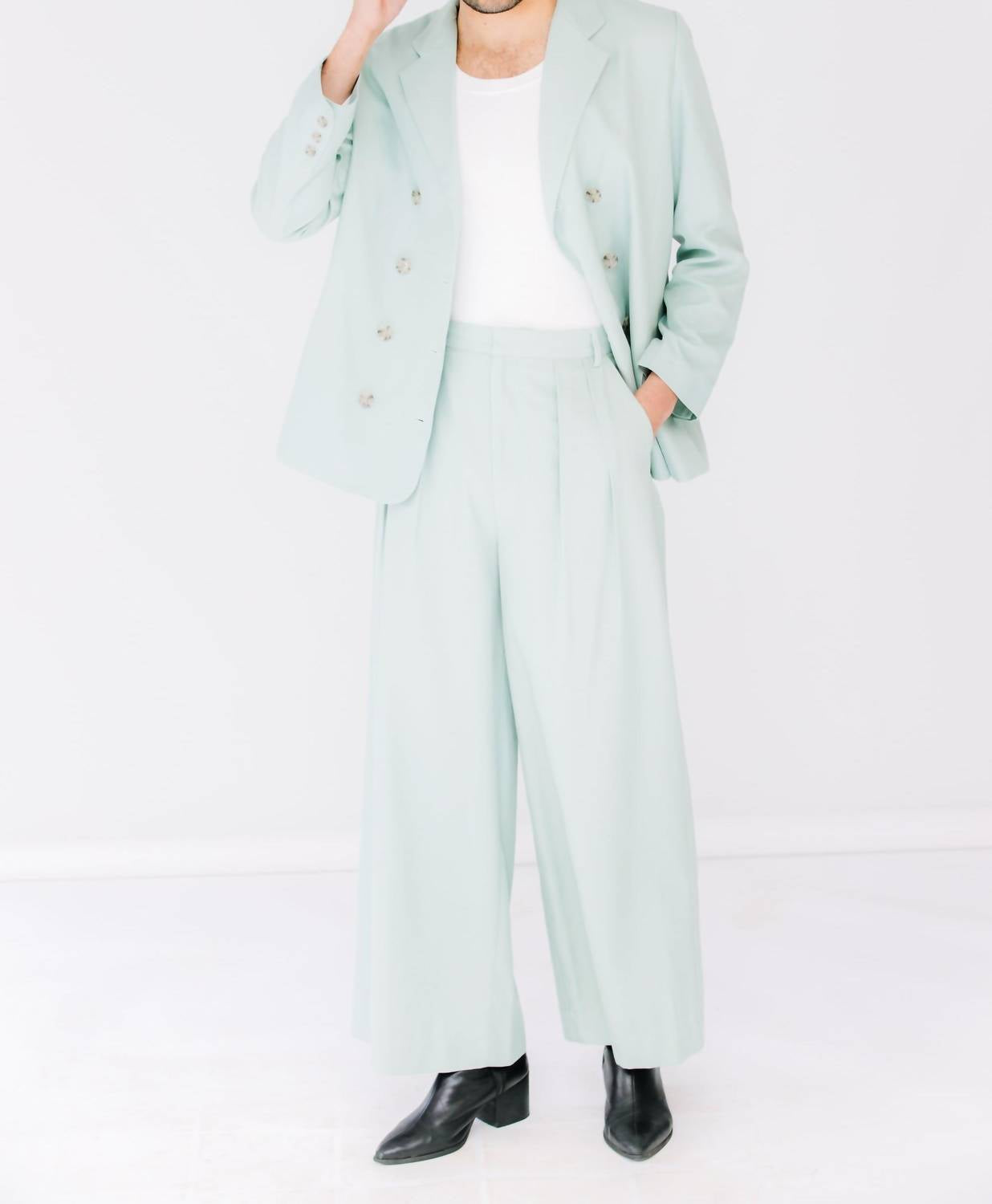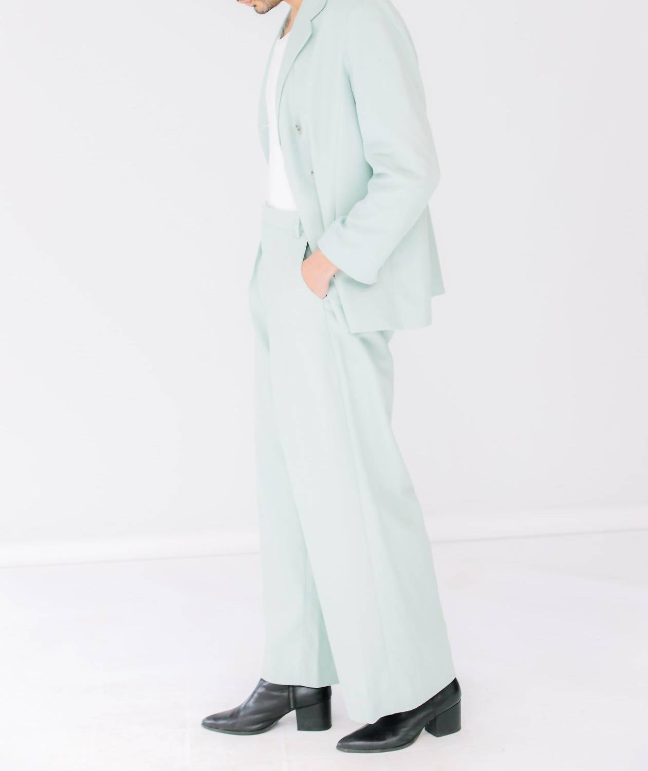 Introducing the Dylan Pant by Christy Lynn, a minimalist silhouette perfect for your Spring wardrobe in a relaxed fit. Crafted from a linen blend with a straight-leg style, these trousers are ethically made in Brooklyn, NYC, and come in a versatile light teal color. Featuring a hook and eye closure, flat waistband, pleats, and practical pockets, they are ideal for a dinner party or Thanksgiving gathering. For best results, dry clean only. Lacey is 5'5" wearing a size 4, and Reggie is 6'2" wearing a size 12.