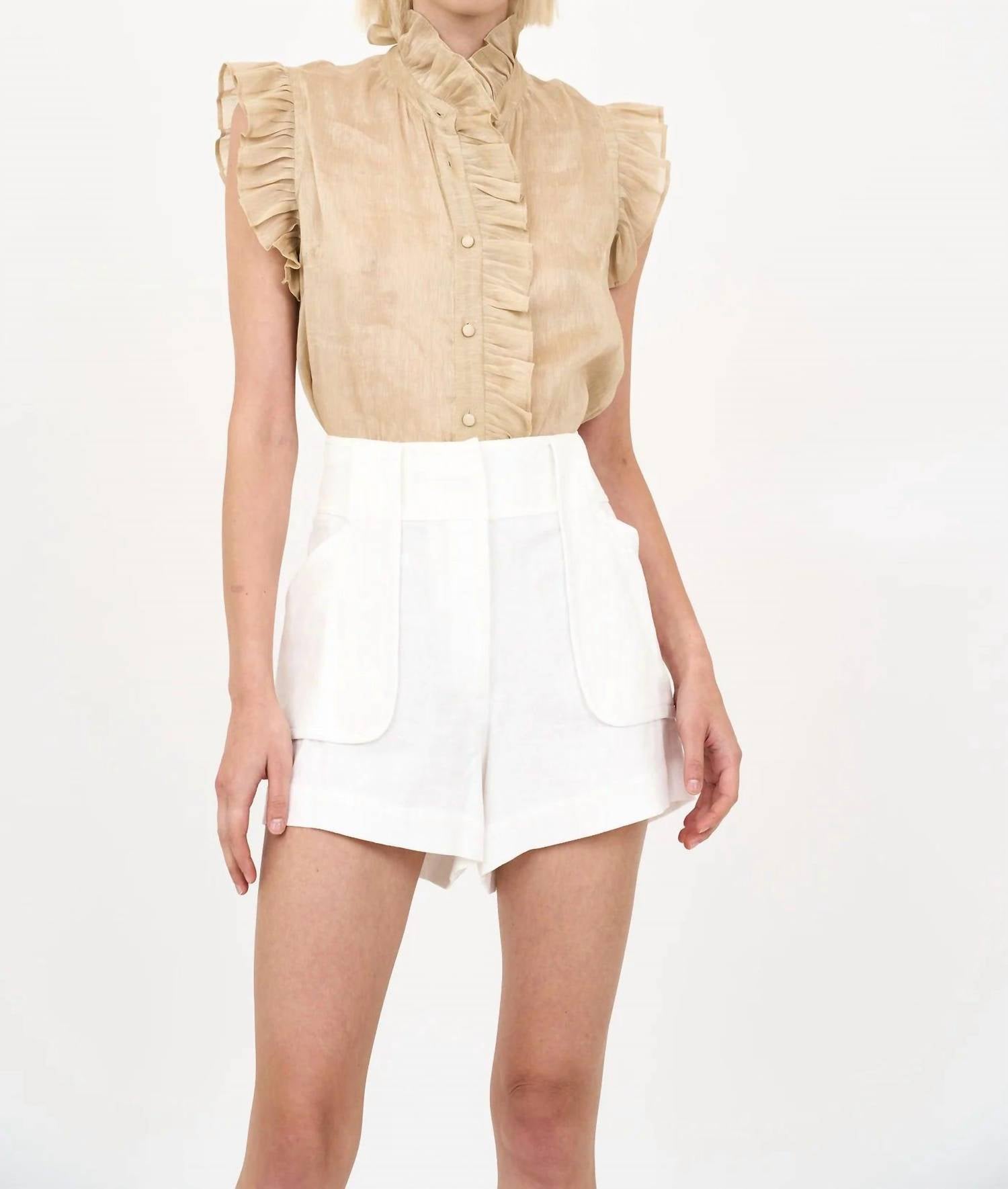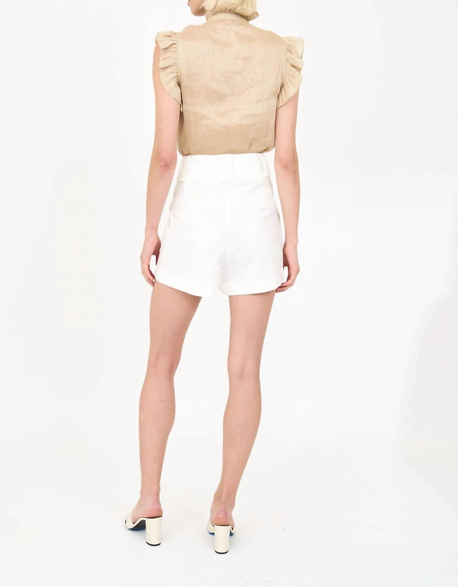 Enhance your summer wardrobe with the Emma Short by CHRISTY LYNN, a perfect blend of sophistication and comfort in solid white. This high-waisted short features a convenient pull-on style, highlighted by a patch pocket detail and a self-tie fabric belt. Composition: Cotton/Linen blend. Care: Dry clean only.