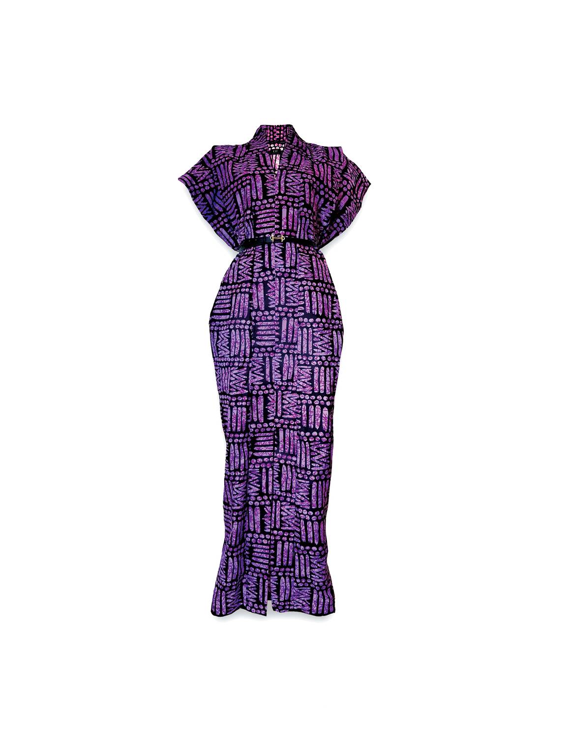 A maxi dress that is just as cute as it is comfortable. Embrace the Boho Chic vibe. Featuring short sleeves and a shift silhouette. Boasts a captivating geometric pattern in rich purple hues, complete with practical pockets and a dramatic front slit for added allure. High-quality fabric for comfort and style. Button closure. Hand wash.